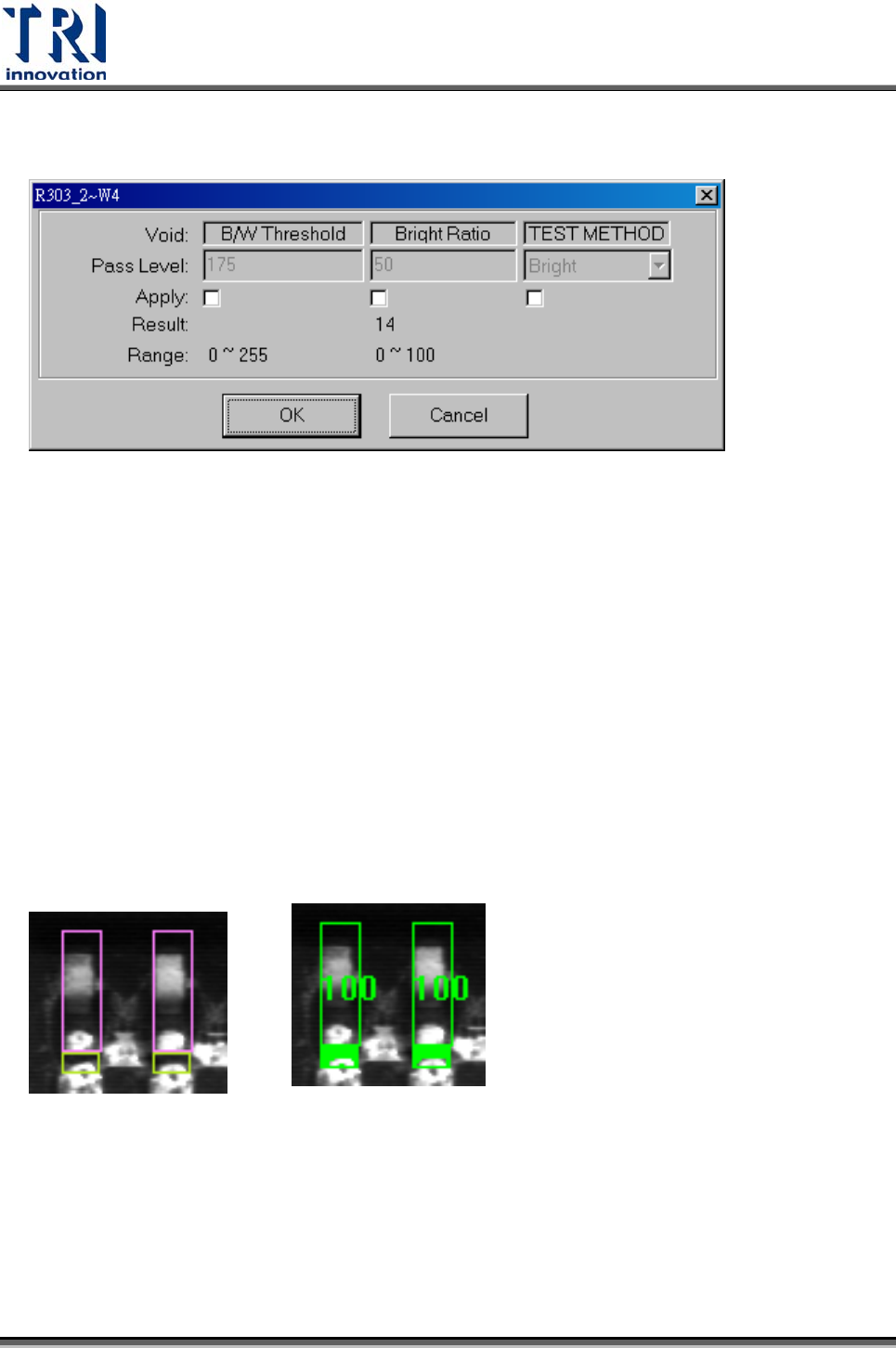 此檢測框是用來檢查元件的空焊、缺件、極性。利用灰階值(0-255)來設定門檻值及所