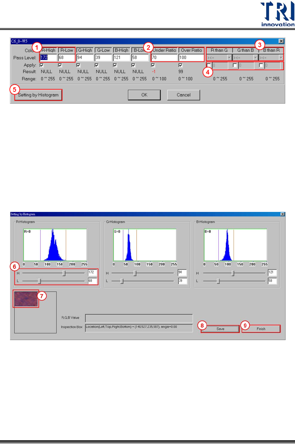 Test Research Inc. TR7500SeriesUserGuide – Software 405 1) RGB 上下限設定 2) 設定超過或低於標準比例值,面積小於 [Under Ratio] 或大於 [Over Ratio] 則為 Fail 。 3) 設定 RGB 值關係式 ( 大於、小於 ) ,可為負值 4) 除了設定關係式,還可以設定兩者的差值 5) 可顯示檢測框之 RGB 分布 ( 下頁 ) 6) 可…