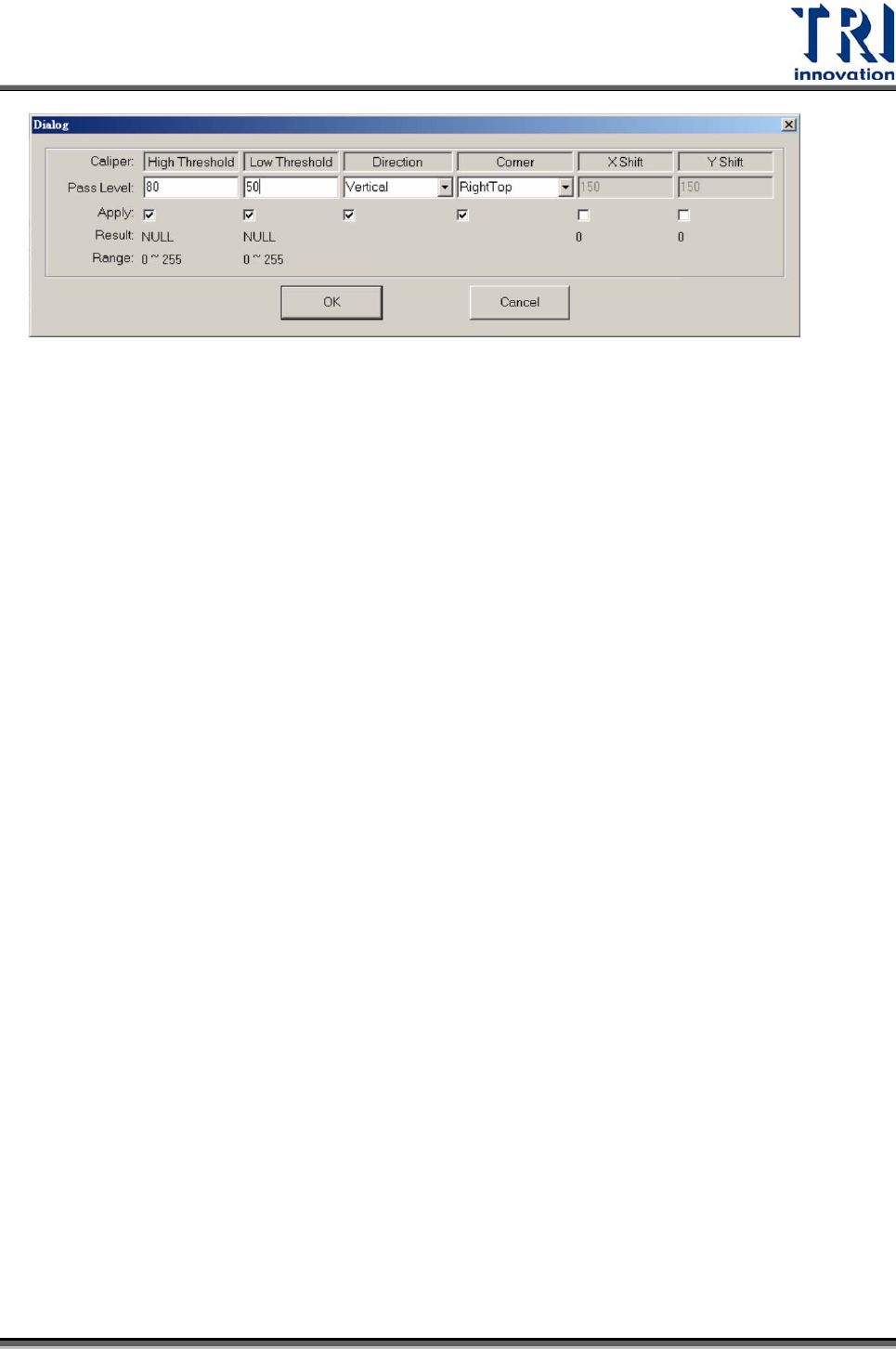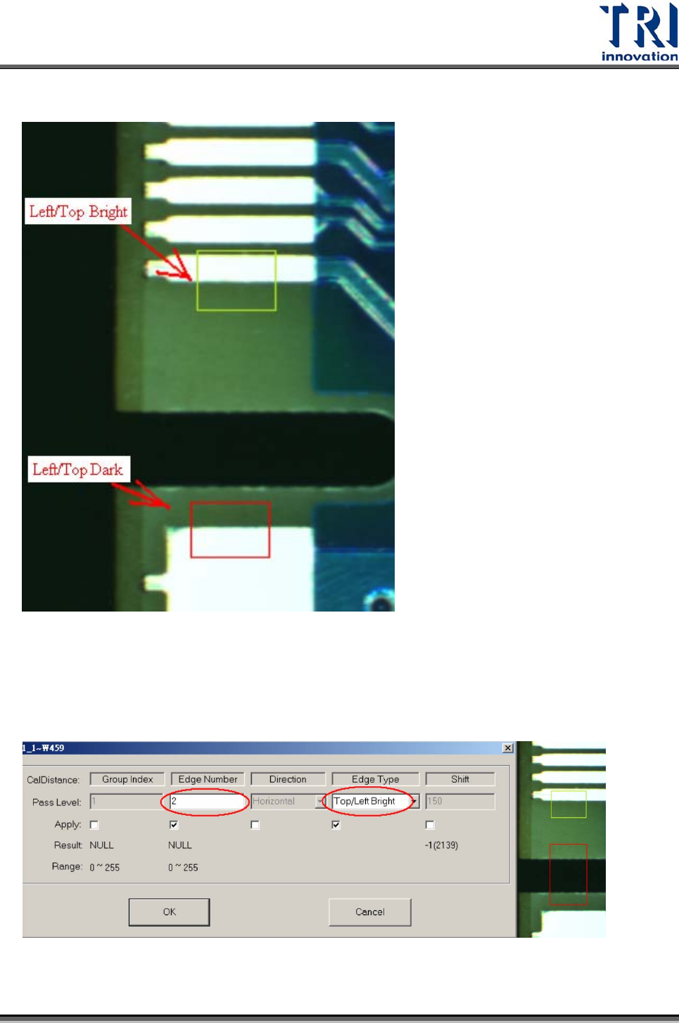 Test Research Inc. 408 TR7500SeriesUserGuide – Software PASS FAIL 參數設定  Group Index – 群組編號。同一元件內有相同編號的視為一組,考慮同一組有可能 跨不同的 FOV ,所以使用 Group Index 來連結。舉例來說,如果同一元件內新增六 個 CalDistance 檢測框,那正常狀況下 Group Index 會自動被設為 1 、 1 、…
