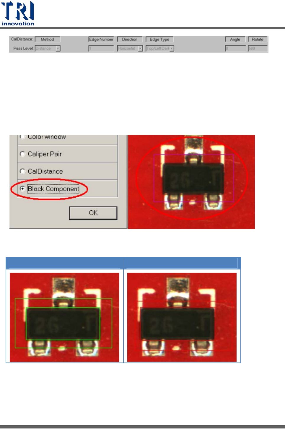 Test Research Inc. 412 TR7500SeriesUserGuide – Software 4.10.2.16 Black Component 本檢測框主要用來檢測表面上無特徵點的黑色元件,其偏移或缺件的狀況。 設定方式-在 Train 視窗下,選定適當的元件進行 [ 增加 1 個框 (Add 1 Box)] 功能,並 選擇 [Black Component] 。產生的檢測框會自動完成學習的動作。只須注意檢…