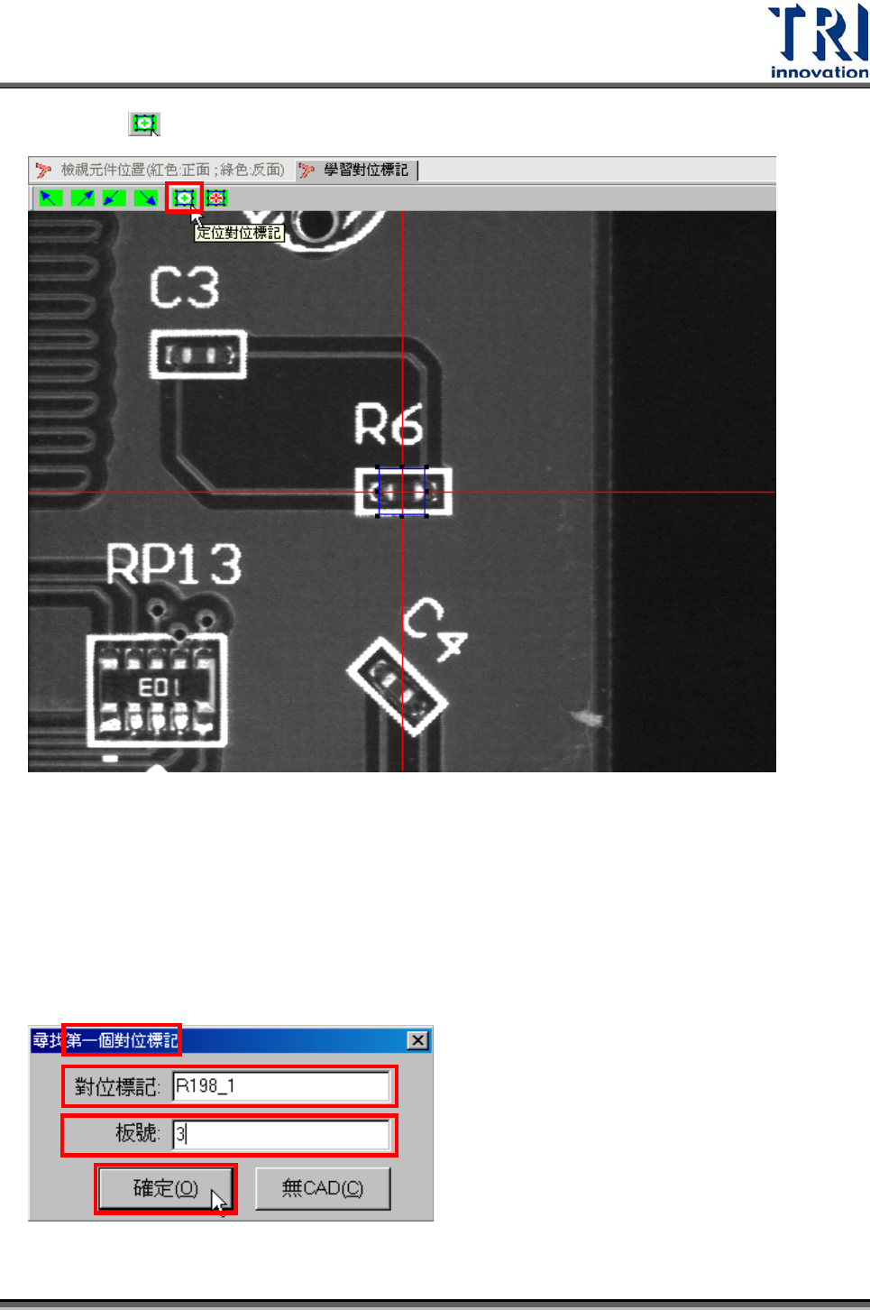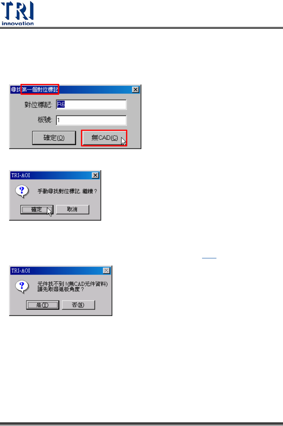 Test Research Inc. 32 TR7500SeriesUserGuide – Software 無 CAD Step1. 按下 [ 無 CAD] 按鈕 Step2. 出現 [ 手動尋找對位標記 ] 視窗,請按 [ 確定 ] Step3. 需要使用 [ 運動控制視窗 ] 或按滑鼠左鍵來移動攝影機至指定之元件位置 若待測板為單板,且在此步驟選擇 [ 無 CAD] ,則按下此 [ 無 CAD] 按鈕時,系統會出…
