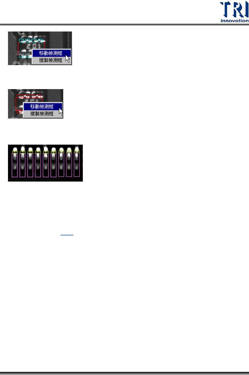 Test Research Inc.  TR7500SeriesUserGuide – Software 435 z 在淺藍色檢測框上同時按下滑鼠左右鍵,可以選擇將該顆元件上目前看到的所有 檢測框移動或複製到目前的 FOV 來檢測。  檢測框方向性 (Box Side) – 若勾選此選項,系統會以圓點來表示腳位的方向性,正 確的方向性圖形如下。若方向性錯誤,可按下 [ 旋轉檢測框的方向性 ] 按鈕來修正。  在控制框中顯…