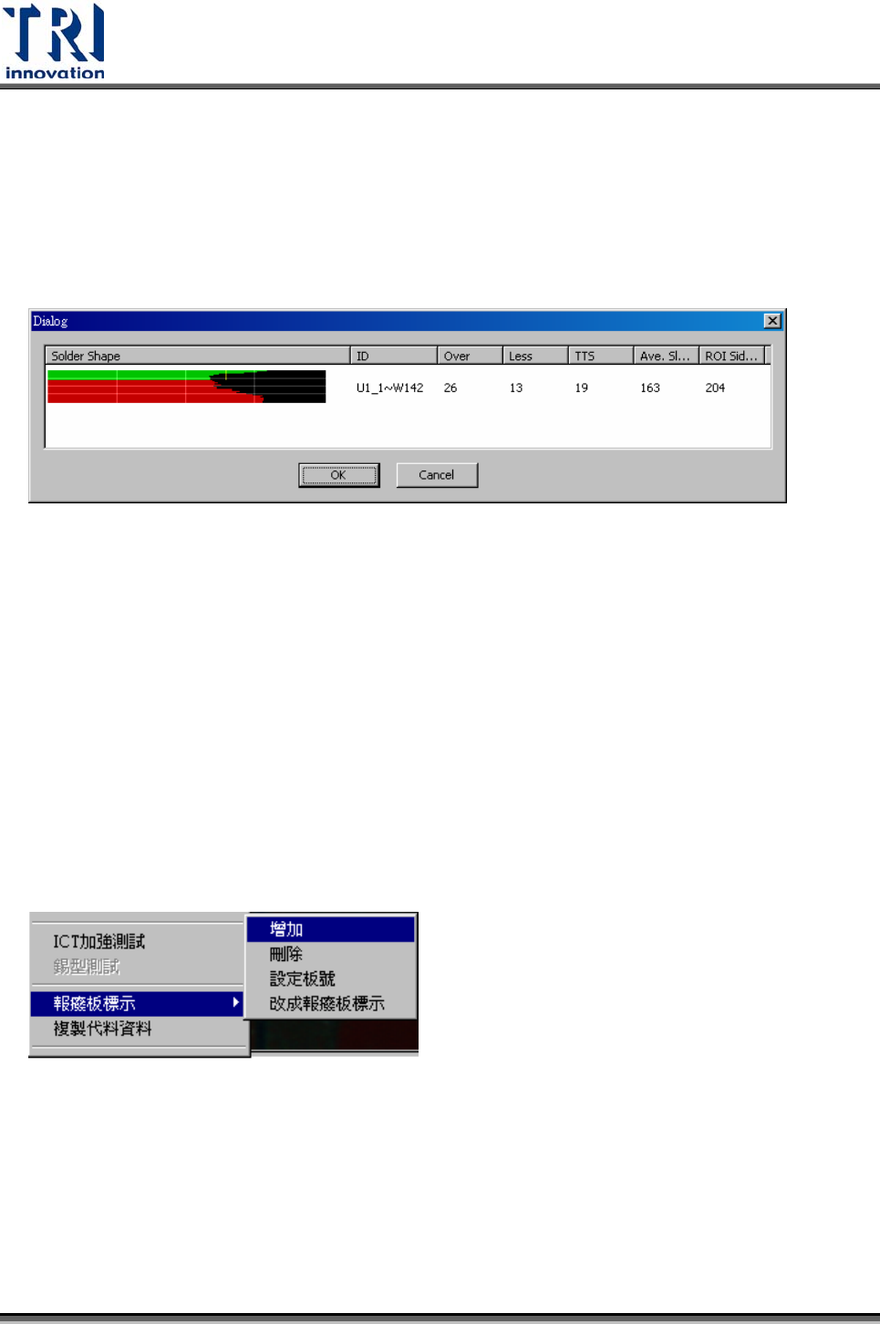 Test Research Inc. TR7500SeriesUserGuide – Software 445 Step2. 按滑鼠右鍵選擇增加報廢板標示點。 Step3. 選擇該點的檢測邏輯。 Step4. 選擇套用範圍。