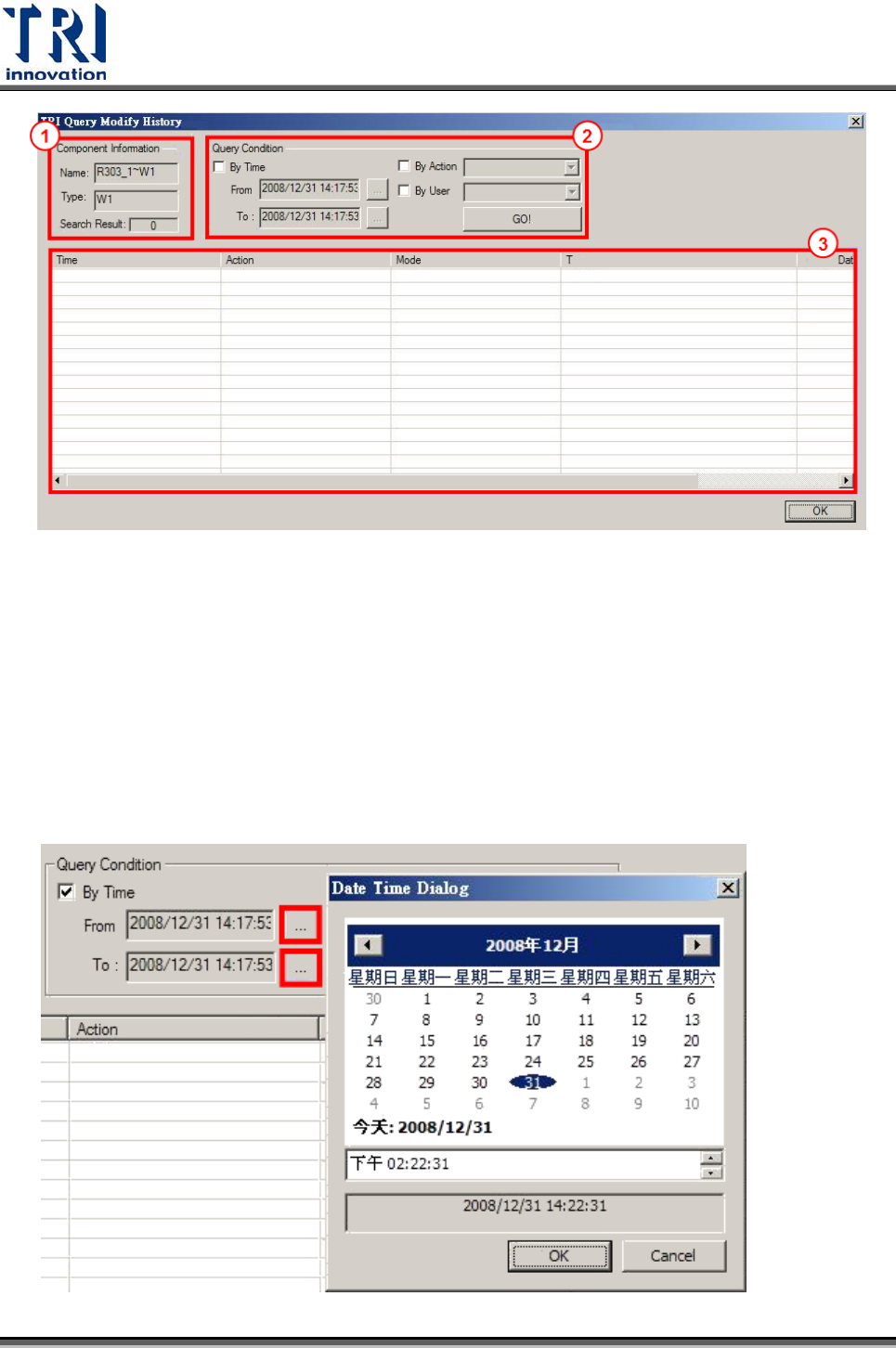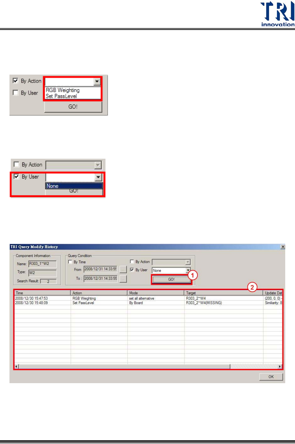 Test Research Inc. TR7500SeriesUserGuide – Software 449 z 動作 (Action) –程式會自動將目前紀錄檔中的所有動作,用下拉表單的方式顯示 出來,以供查詢選擇。 z 使用者 (User) –程式會自動將目前紀錄檔中的所有使用者,用下拉表單的方式 顯示出來,以供查詢選擇。 Step4. 當條件設定完成後,使用者可以按下 [GO!] 按鈕,或是按下鍵盤 [Q] 來進行…