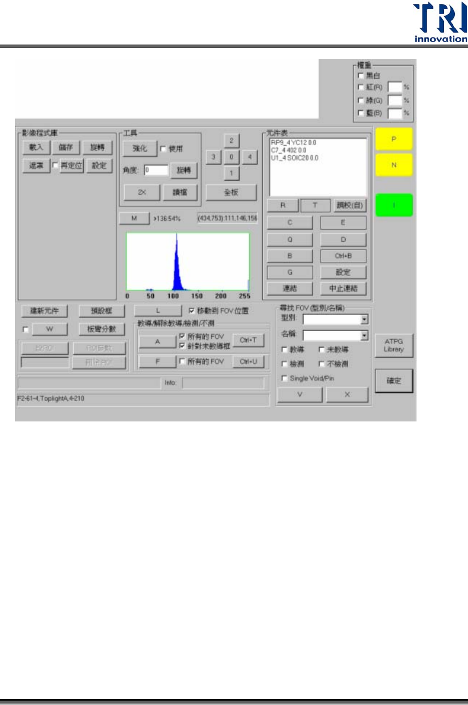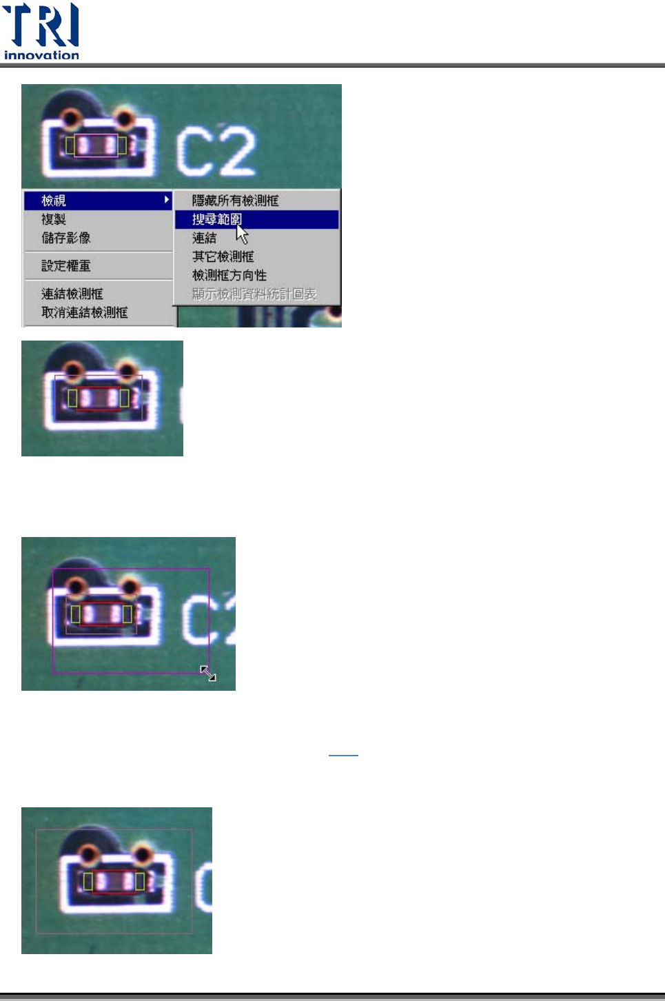 Test Research Inc.  TR7500SeriesUserGuide – Software 453 5.6.2 元件表 (C OMPONENT L IST ) 5.6.2.1 設範圍 (Set Rng) 改變影像比對類型檢測框 (Missing/MissingPolarit y/Lead/Align/Warp) 的搜尋範圍。系 統會給予檢測框一預設的搜尋範圍,並在此檢測範圍內搜尋是否有與標準影像相似性 高的影像…
