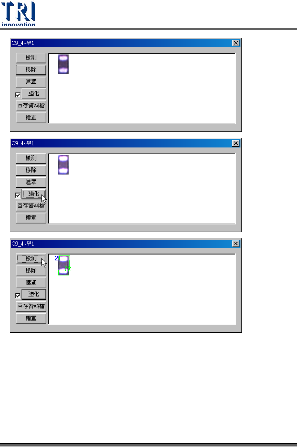 Test Research Inc.  TR7500SeriesUserGuide – Software 459  遮罩 (Mask) – 對於代料影像進行遮罩動作,對於遮罩功用與進行步驟請參考 4.9.8.2 。  強化 (Enhance) – 可以針對代料影像進行亮度和對比的加強,而取消前方打勾符號 可以將強化的設定解除。