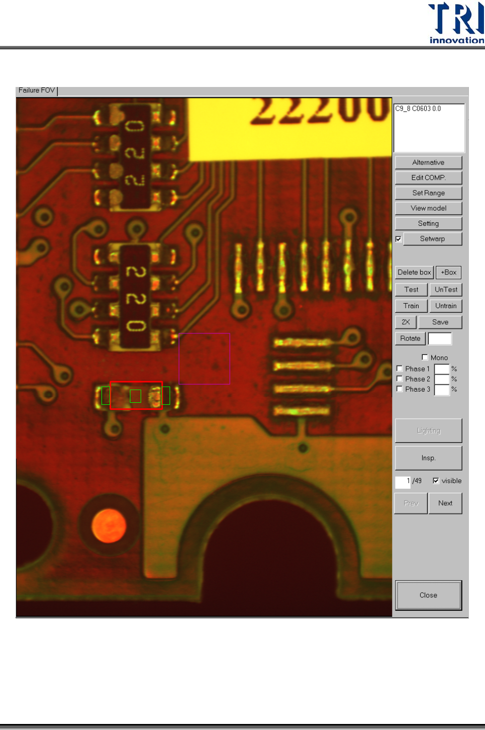 Test Research Inc. 492 TR7500SeriesUserGuide – Software  設定範圍 (SetRange) – 設定檢測框的搜尋範圍。  設定 (Setting) – 設定檢測框的比對條件。  刪除框 (Delete box) – 刪除所選擇的檢測框。  加框 (+Box) – 對於選擇的元件增加檢測框。  檢測 / 不測 (Test/UnTest) – 設定選擇的檢測框為測試或…
