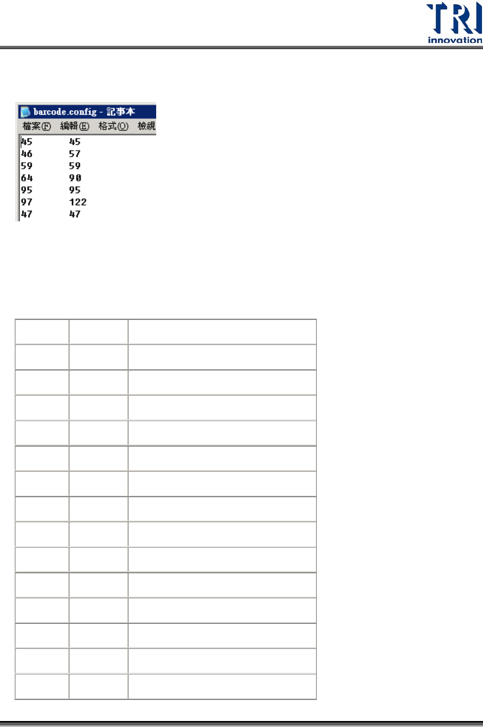 Test Research Inc. TR7500SeriesUserGuide – Software 511 2) 假設使用者現在希望新增 [ / ] (ASCII = 47) 為容許的特殊字元,在檔案中加入 47 47 ( 中間用 Tab 鍵分開 ) ,再存檔。 3) 重新開啟 AOI 主程式,這樣就可以讓希望的特殊字元不會被濾掉。 ASCII Table Character HTML Explanation 00…