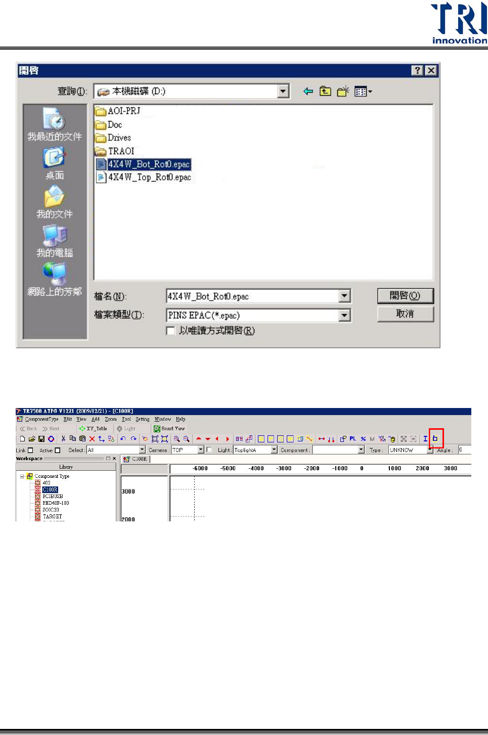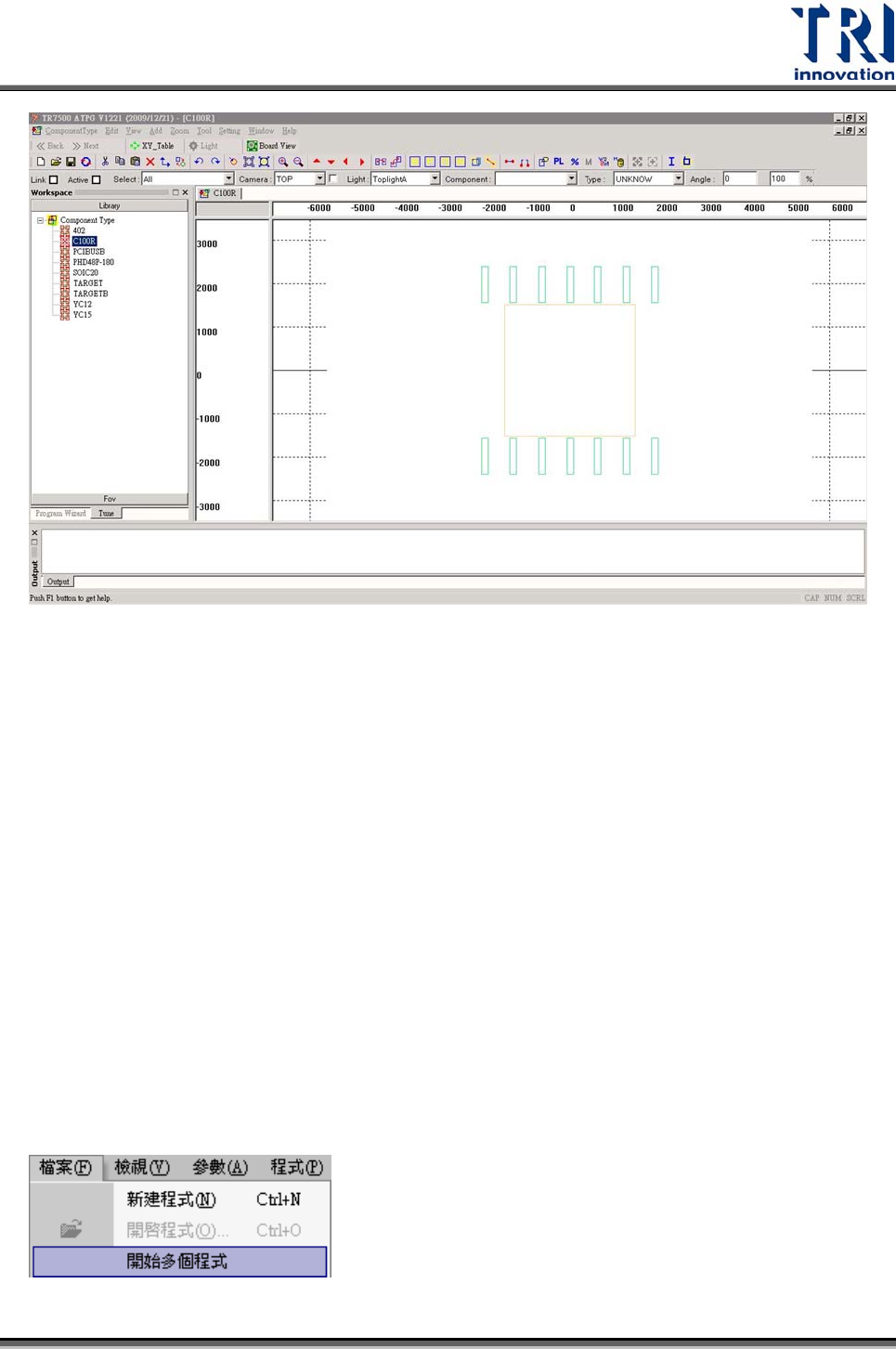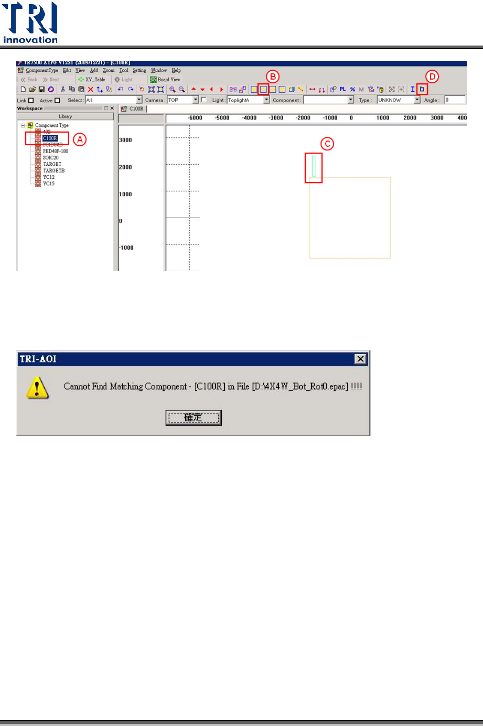Test Research Inc. 528 TR7500SeriesUserGuide – Software • 如果所選擇的元件,並沒有存在於 epac 檔案中,則會顯示找不到相對應元 件的訊息。 • 元件的 Body 框會影響腳位產生,所以 Body 框的大小要根據實體影像,拉 出正確的框。 Step6. 自動產生腳位完成。