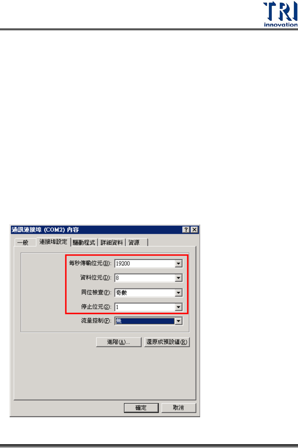 要一致,資料才不會遺失。BaudRate = 19200, Data Bits = 8, Parity = Odd, Stop Bits
