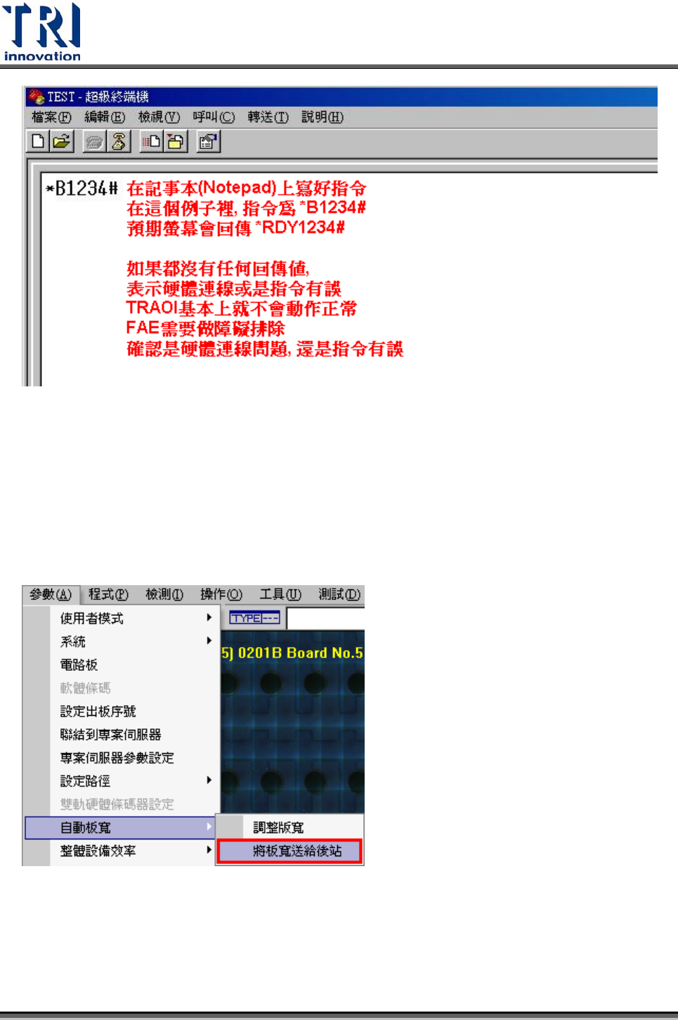 Test Research Inc. 538 TR7500SeriesUserGuide – Software 3) 使用說明 Step1. 登錄檔 [AutoConveyerWidth] 要根據現場機台的軌道進行設定。一段式軌道 AutoConveyerWidth = 1 ,二段式軌道 AutoConveyerWidth = 2 。 Step2. 選擇 [ 自動板寬 (Auto Conveyor Width Ouput)/ …
