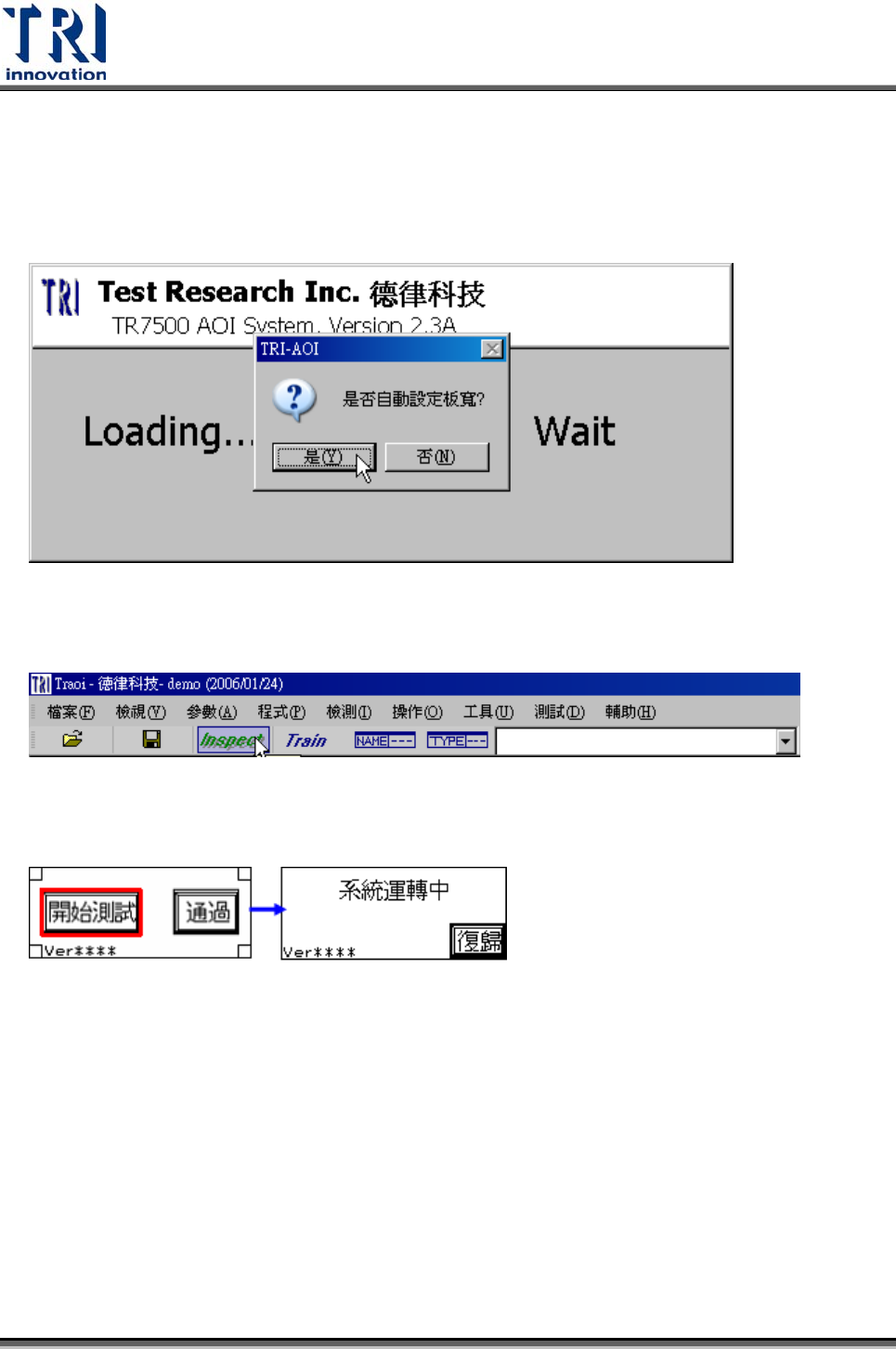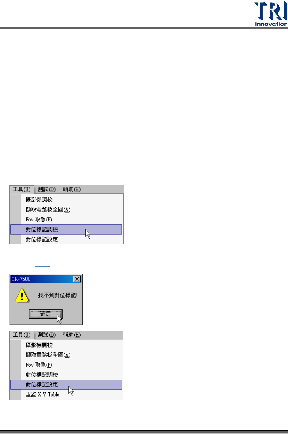 Test Research Inc. TR7500SeriesUserGuide – Software 545 8.4 連線至維修站 1) 將 [ 參數 / 使用者模式 / 連結維修站 ] 選項打勾。 2) 將 [ 參數 / 電路板 / 維修站 ] 路徑選擇連接至維修站之 [AOI_Repair_Data] 資料夾。 3) 按下 [ 工具 / 重送影像資料至維修站 ] 。 4) 開始檢測。 8.5 程式跨機台使用 1) 將…