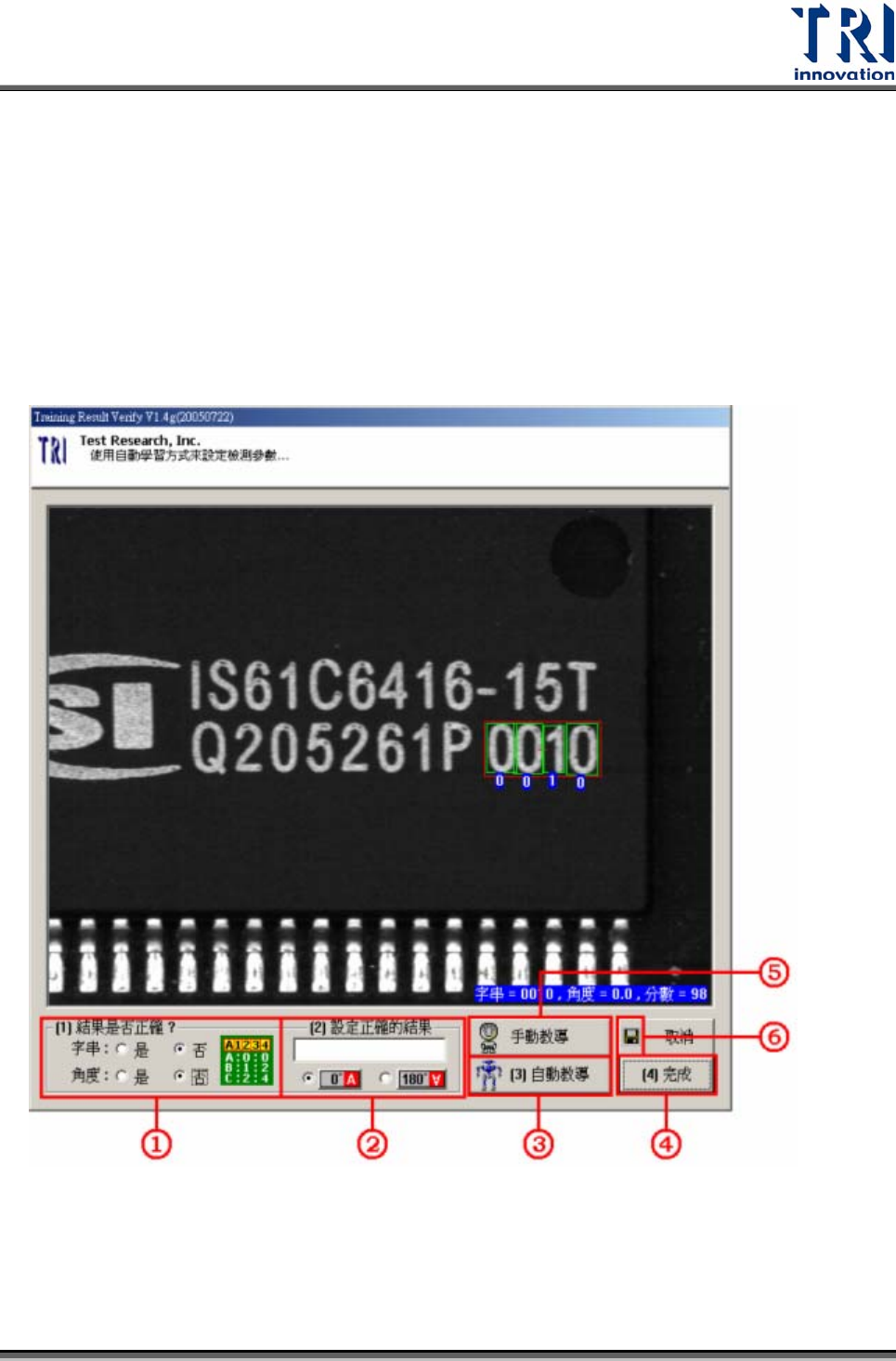 578 TR7500UserGuide – Software 1) 結果判定選項 2) 正確資訊輸入 3) 自動教導以產生字型庫 (Auto Train) 4) 完成按鍵 5) 手動教導以產生字型庫 (Manual Train) 6) 儲存圖像檔案 自動教導 (Auto Train) 主要架構於 TRI OCR 之自動學習核心技術上,此核心技術包含 字型庫自動搜尋、 AI 人工智慧辨認以自動切割字元、文字面偏位之自動定位…等功能…