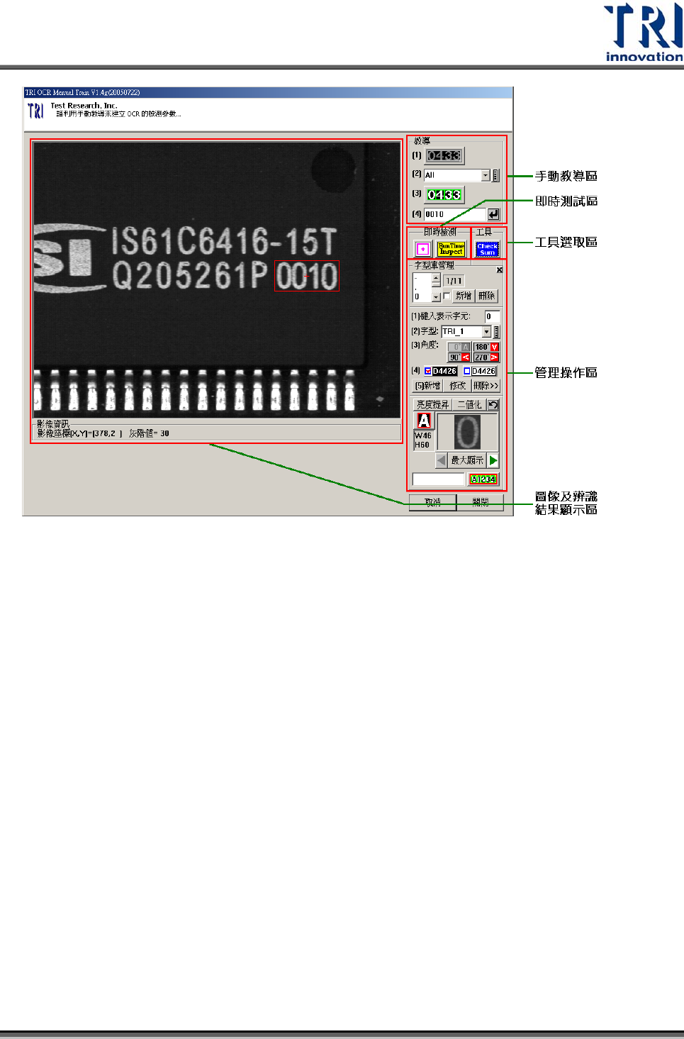 5) 圖像及辨識結果顯示區:在此區可做文字字串拉框、顯示辨識結果等功能。