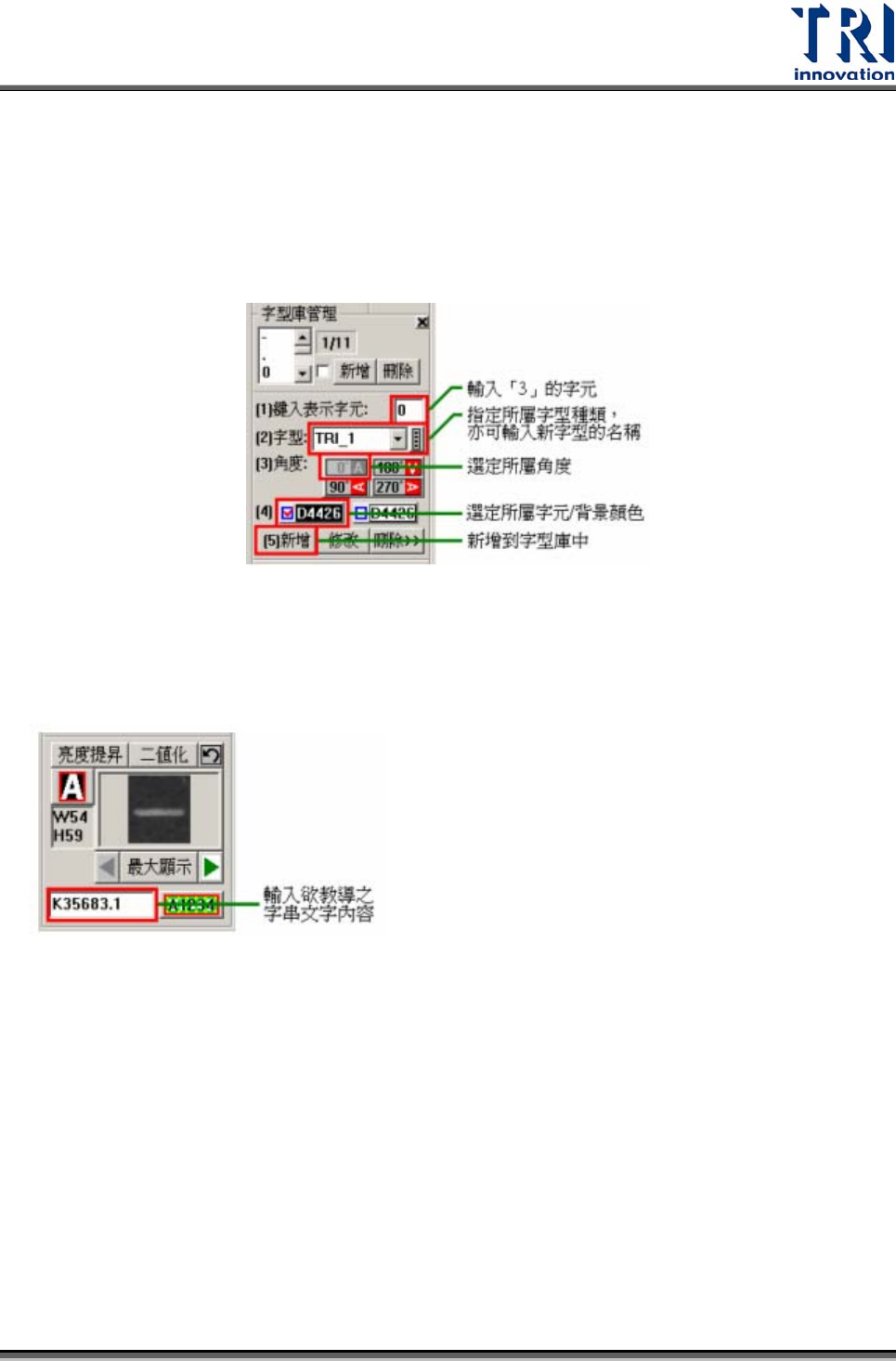 Test Research Inc. TR7500SeriesUserGuide – Software 583 4) 設定所屬之字型種類。 5) 選定所屬之角度。 6) 選定所屬之字元 / 背影顏色。 ( 黑底白字或白底黑字 ) 7) 按下「新增 (Add) 」以新增到字型庫內。 Teach Multi Font 教導多數字型 (Teach Multi Font) 1) 輸入欲教導字型之字串。 2) 按下多數字型教導框…