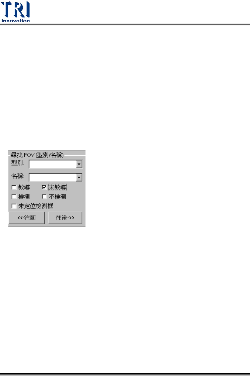 Test Research Inc. TR7500SeriesUserGuide – Software 51 主畫面 2) 依序檢視每個 FOV ,可按下 [ 檢測 ] 按鈕查看此 FOV 的檢測結果。 3) 若有需要可以進行以下微調,詳細功能請參閱 5 ,常使用到的功能有以下幾項: 學習 (Train) 檢測框