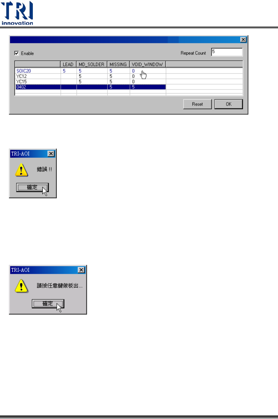 的檢測框連續錯誤次數達到 5次時,系統將會警報。最下面的[Reset]按鈕是用來重