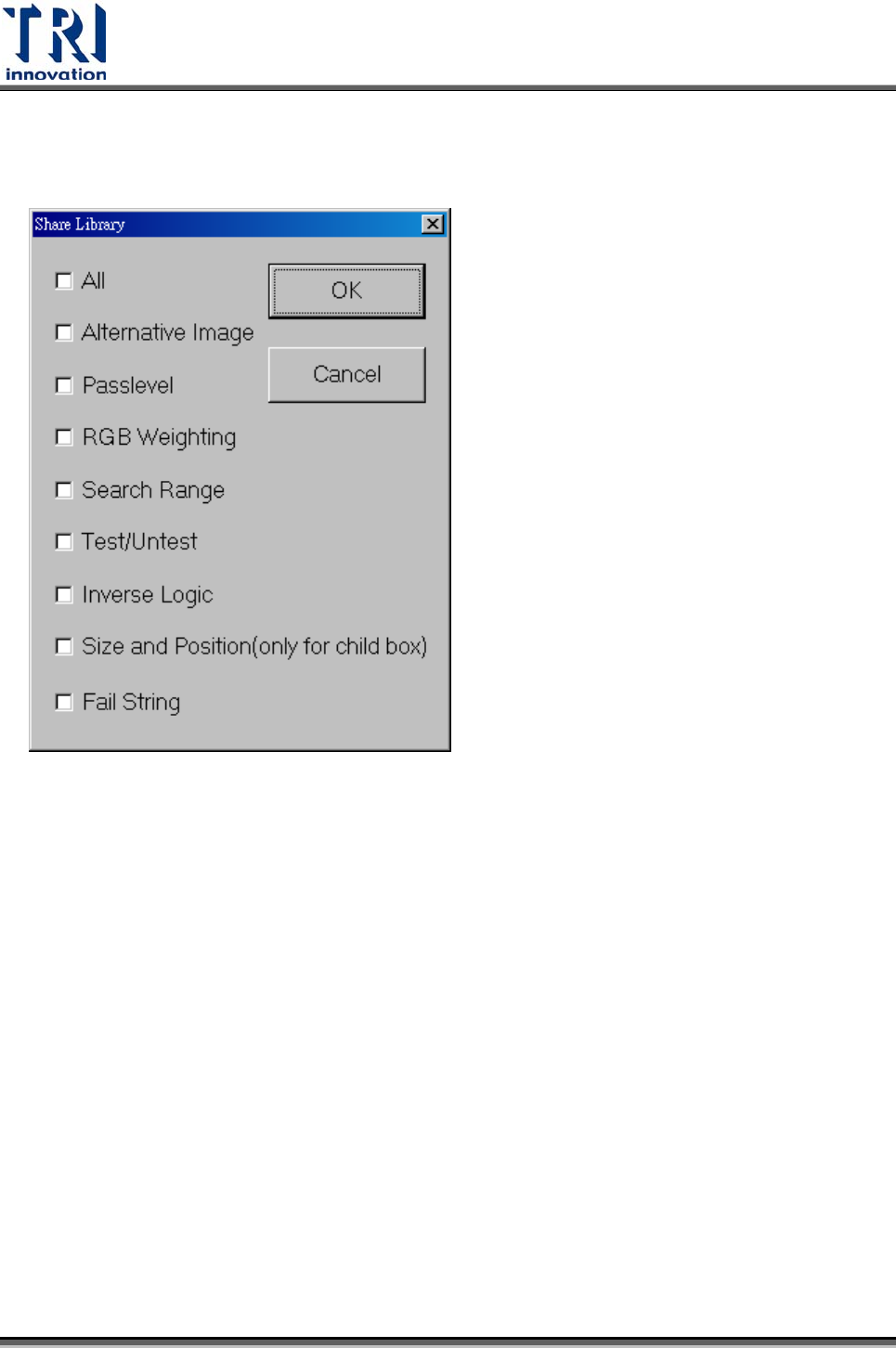 Test Research Inc.  TR7500SeriesUserGuide – Software 75 Project A Project B Library 代料影像 1 代料影像 1 代料影像 1 代料影像 2 代料影像 3 代料影像 2 代料影像 3 代料影像 4 在上表中, ProjectA 的代料影像 1 與代料影像 2 在 Library 中皆有,所以這兩個代料影 像屬於 Global 代料影像,而代料影…