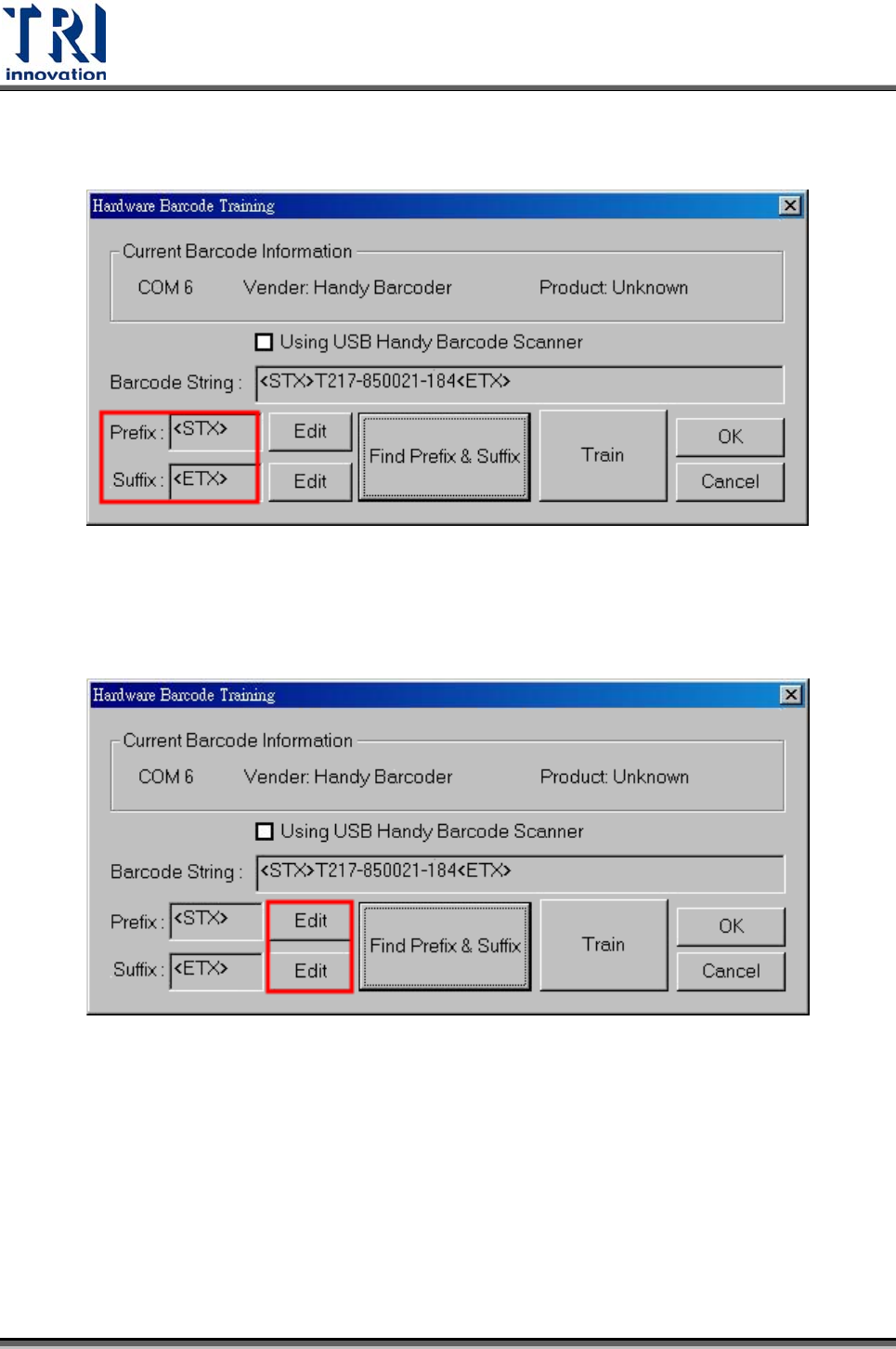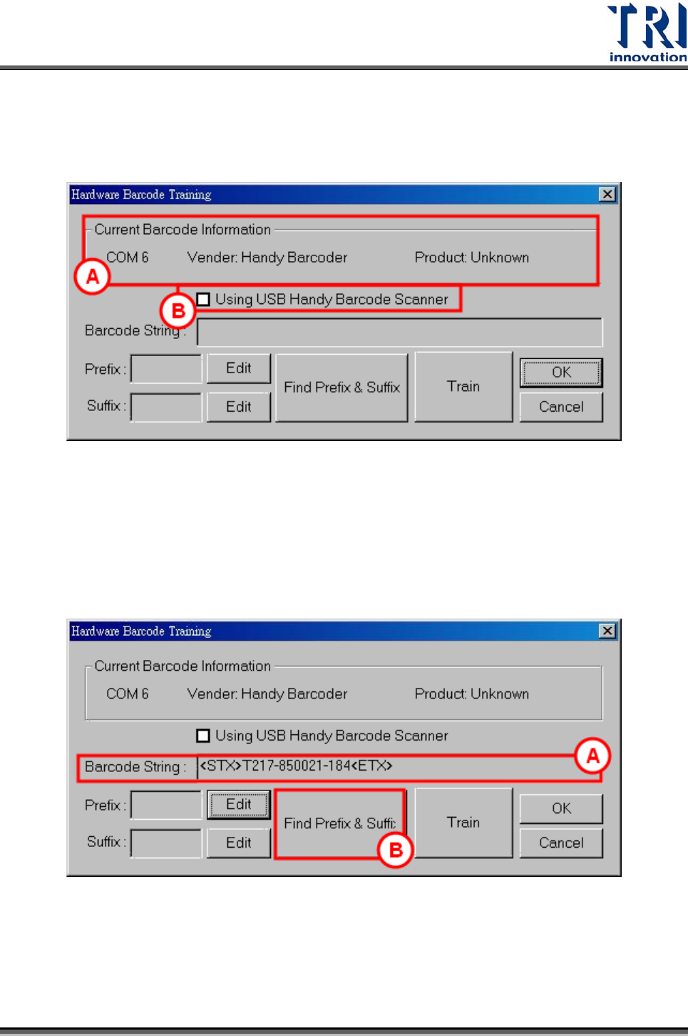 Test Research Inc. TR7500SeriesUserGuide – Software 79 Stpe1. 選擇 [Parameter/ Panel/ Tr ain Prefix & Suffix] 。 Stpe2. 對話框出現後,會觸發手持式硬體條碼器開始運作。此時系統正在等待 使用者讀取條碼,以便進行判斷。 A. 顯示手持式硬體條碼機的資訊。 B. 顯示機台正在使用 USB 手持式條碼機。 St…