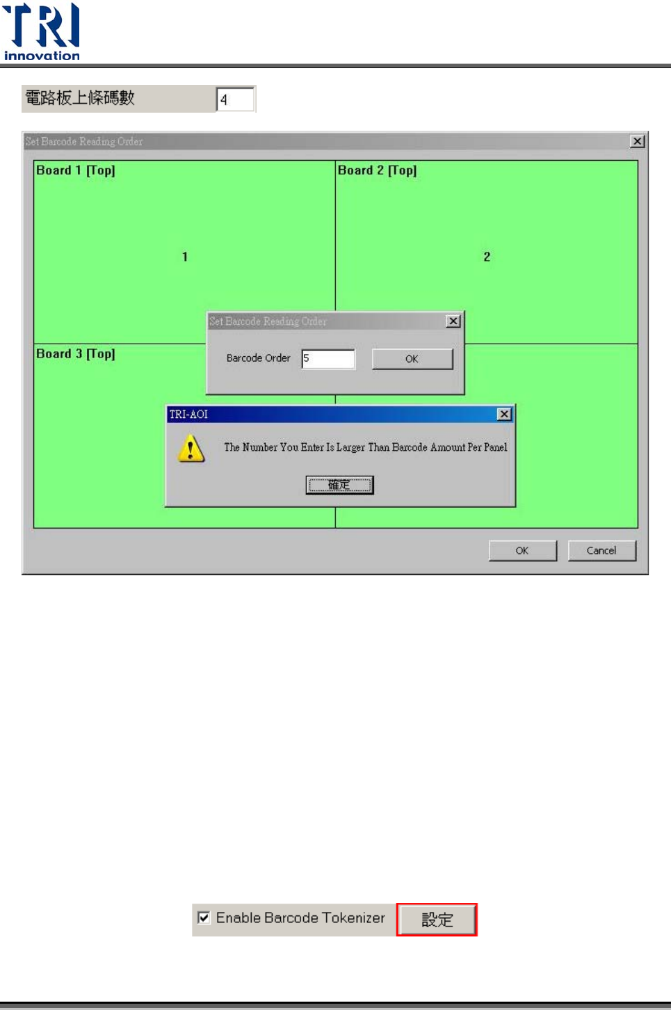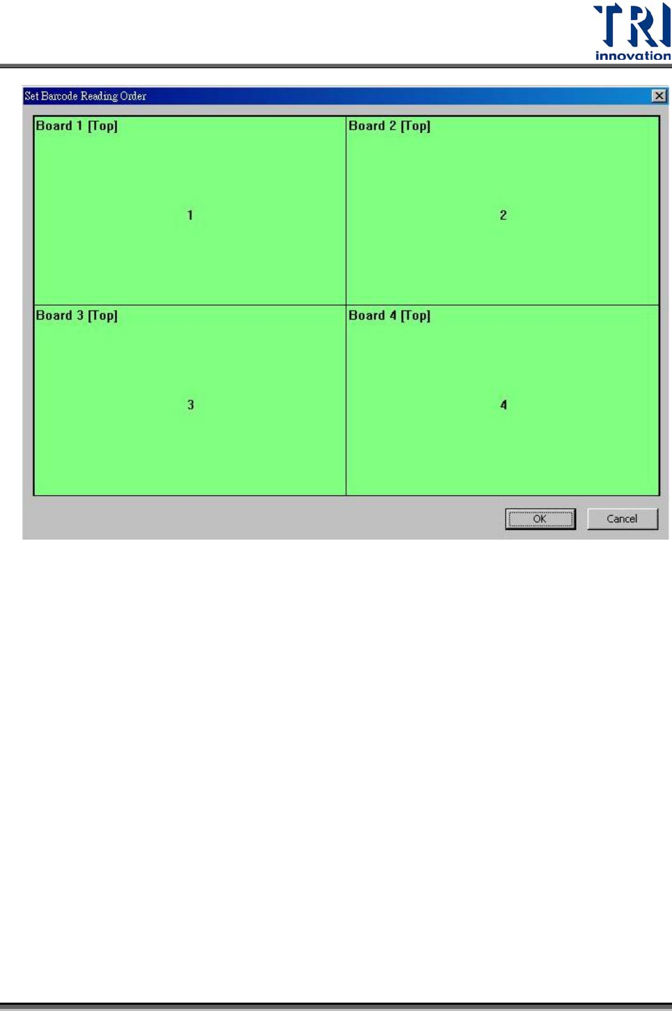 Test Research Inc. TR7500SeriesUserGuide – Software 83 Step3. 在希望改變順序的 Board 方塊按下右鍵,就會跳出對話框,讓使用者手動填 入。 手動 Key In 的條碼順序值 是不可以超過 預計輸入的條碼數量 ,例如使 用者設定欲讀的條碼數為 4 ,但是手動輸入為 5 ,就會跳出警示視窗