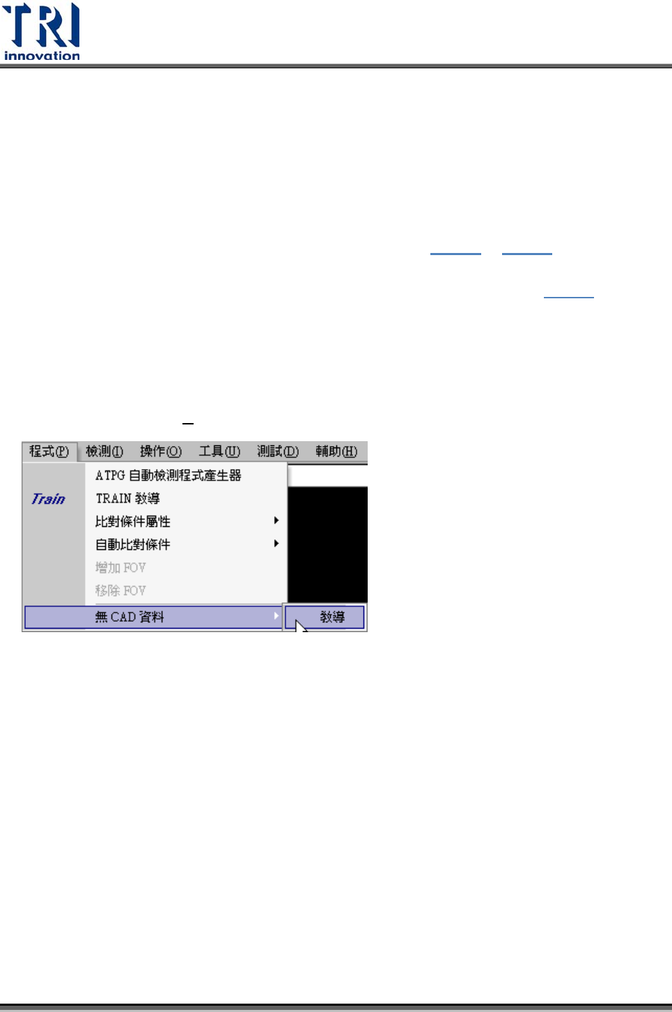 Test Research Inc. TR7500SeriesUserGuide – Software 141 3.4.6 移除 FOV(D ELETE FOV) 只有在 [Train] 畫面開啟時,此功能才有作用。而且需該 FOV 中無檢測框。 點選 [ 移除 FOV] 按鈕時,會剩下左上方大圖以及左下方的 FOV 影像,移除 FOV 的 方法有二: z 可以直接在大圖上點選要移除的 FOV 位置,而攝影機會移動…
