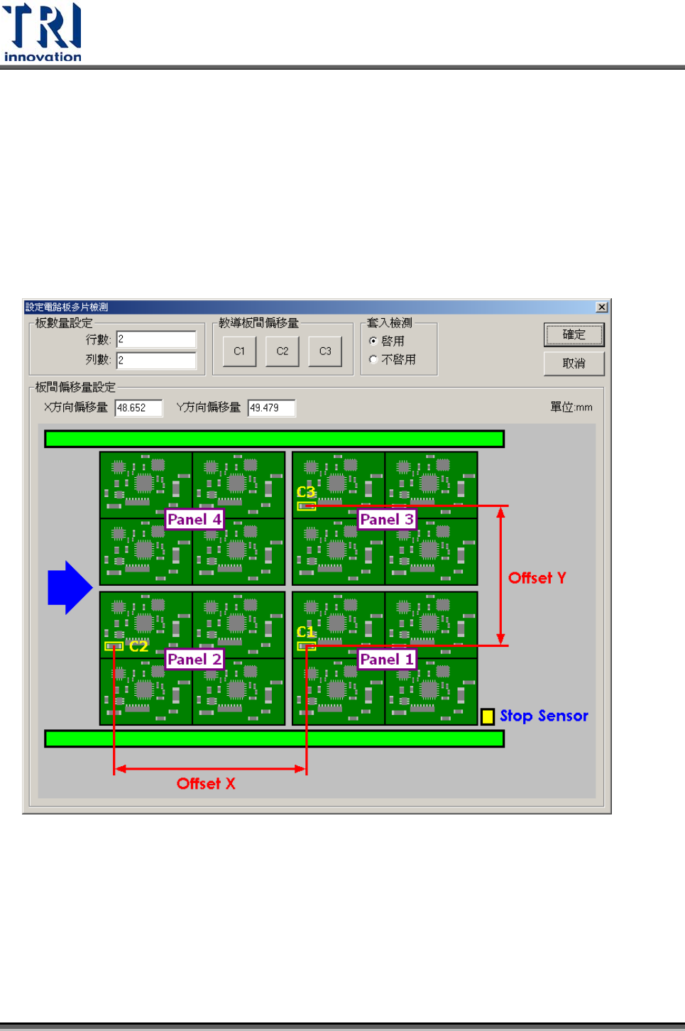Test Research Inc. 174 TR7500SeriesUserGuide – Software 3.4.10 設定電路板多片檢測 (M ULTI P ANEL A LIGNMENT S ETTING )  若有同時將兩片以上板子送入機器中檢測的需要,可啟用此功能。在自動模式下 時,系統會依序檢測各片板子。在確認模式下時,每檢完一片板需經人員作確認 後,系統再進行下一片板子的檢測,待每一片板都檢測且確認完畢後才…