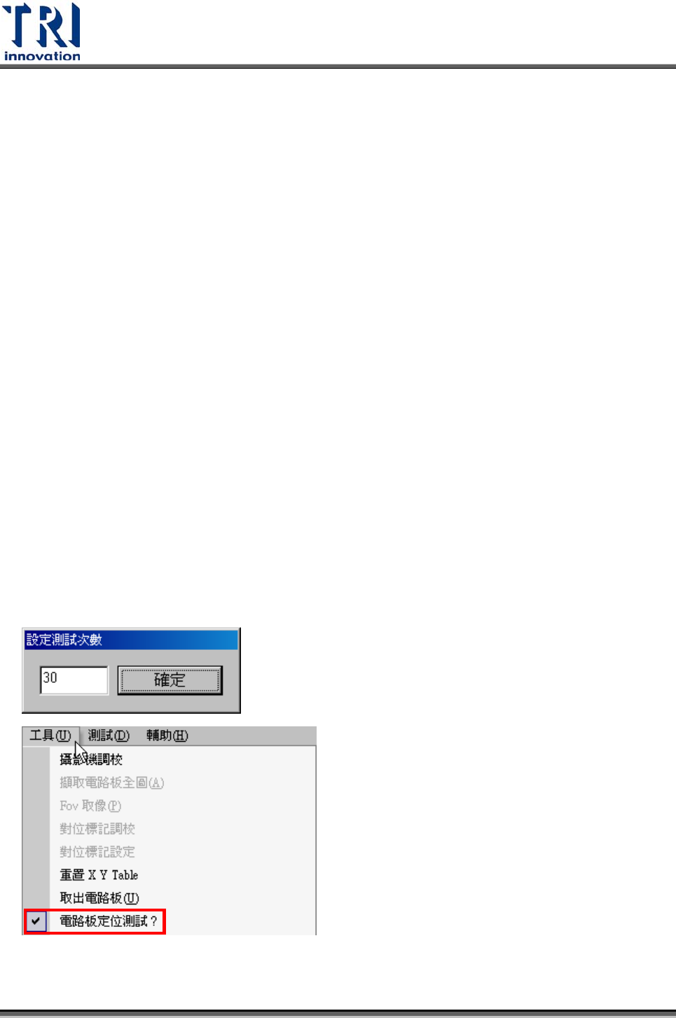 Test Research Inc. TR7500SeriesUserGuide – Software 195 z 在此畫面下按鍵盤上之 [fid] 三個字母後,畫面上會產生 [Search] 及 [Apply Weighting] 兩個按紐,其功能如下: z [Search] -按下本按鈕可以顯示對這個影像檢測的分數。例如顯示 [91/61] ,就表 示檢測結果為 91 分而門檻分數設定為 61 。