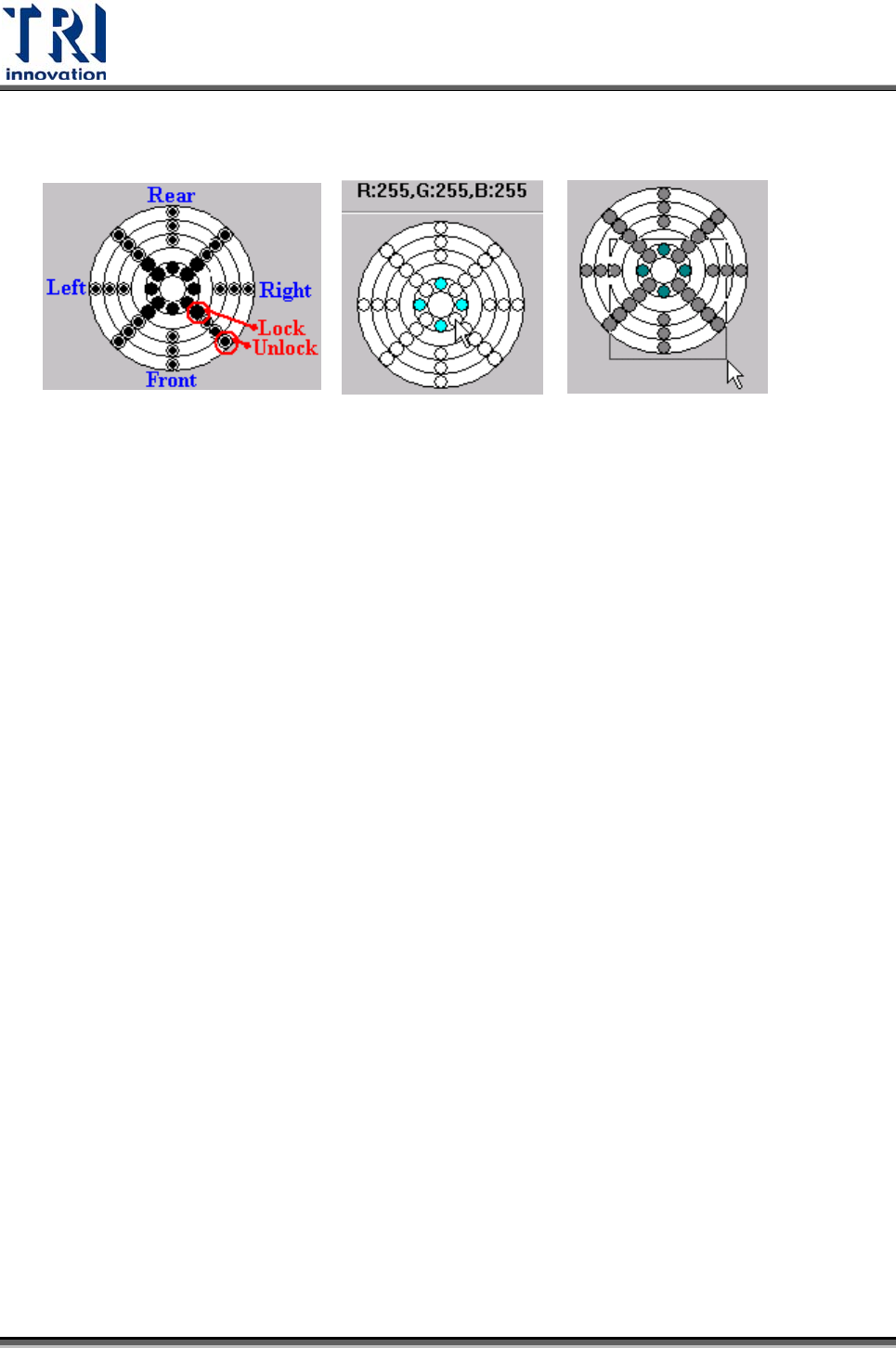 Test Research Inc. 302 TR7500SeriesUserGuide – Software 1) LED 區域控制 – 此區以圖形表示 LED 板的各區域位置,圖示的下方表示前方的光源,如圖所示。光 源可以分成 36 區來作調整。 除了中央圓圈區域外的 28 區每區都可以分別調整紅、綠、藍三種光源之強弱。 正中央最小圓形部分是在控制同軸光源的亮度。 ( 選配 ) 自光源調整區域以滑鼠左鍵點選…