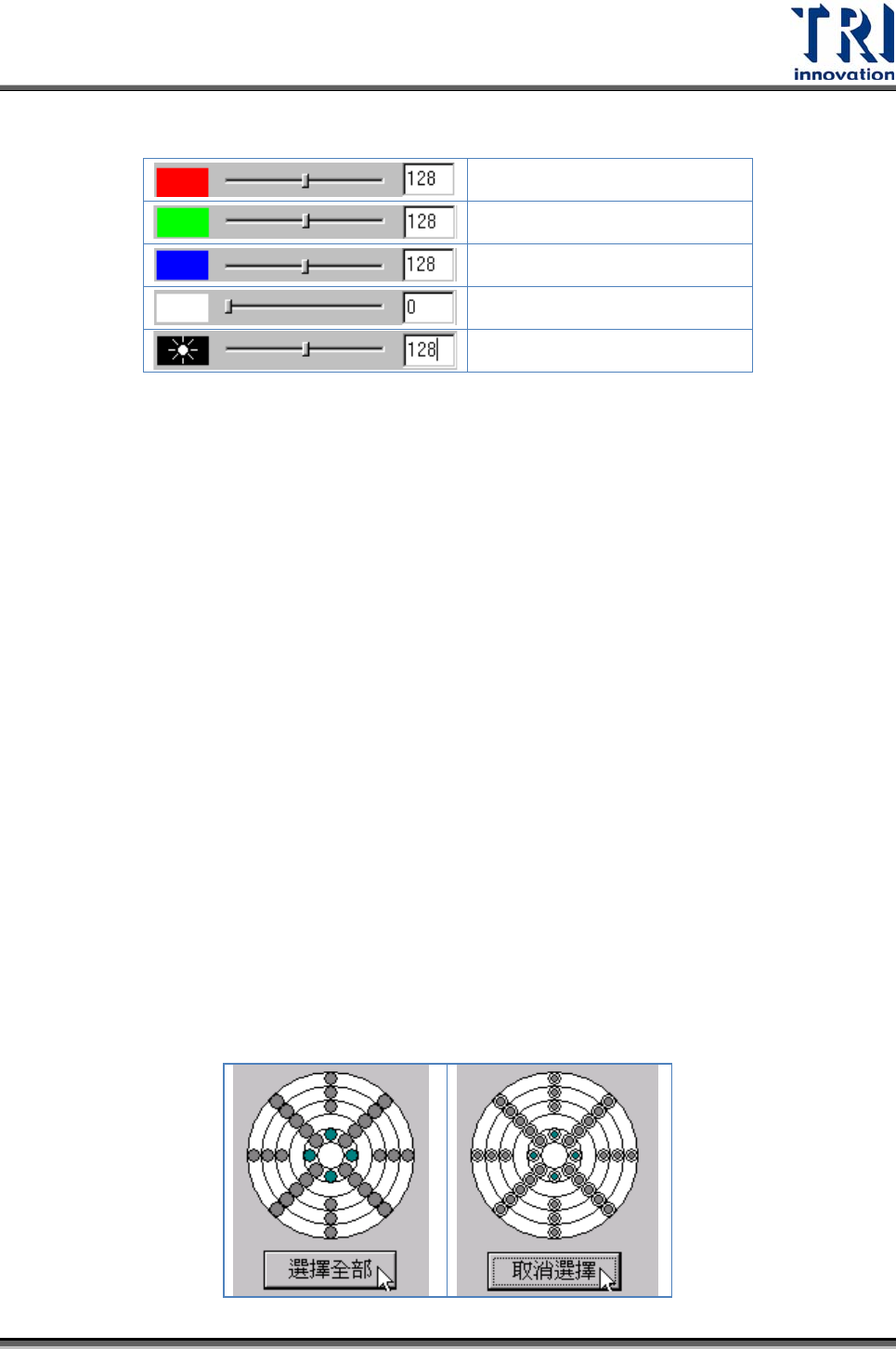 取消選擇(Unselect All) – 按下次按鈕可將所有 LED 的控制區域開啟,按下後按鈕