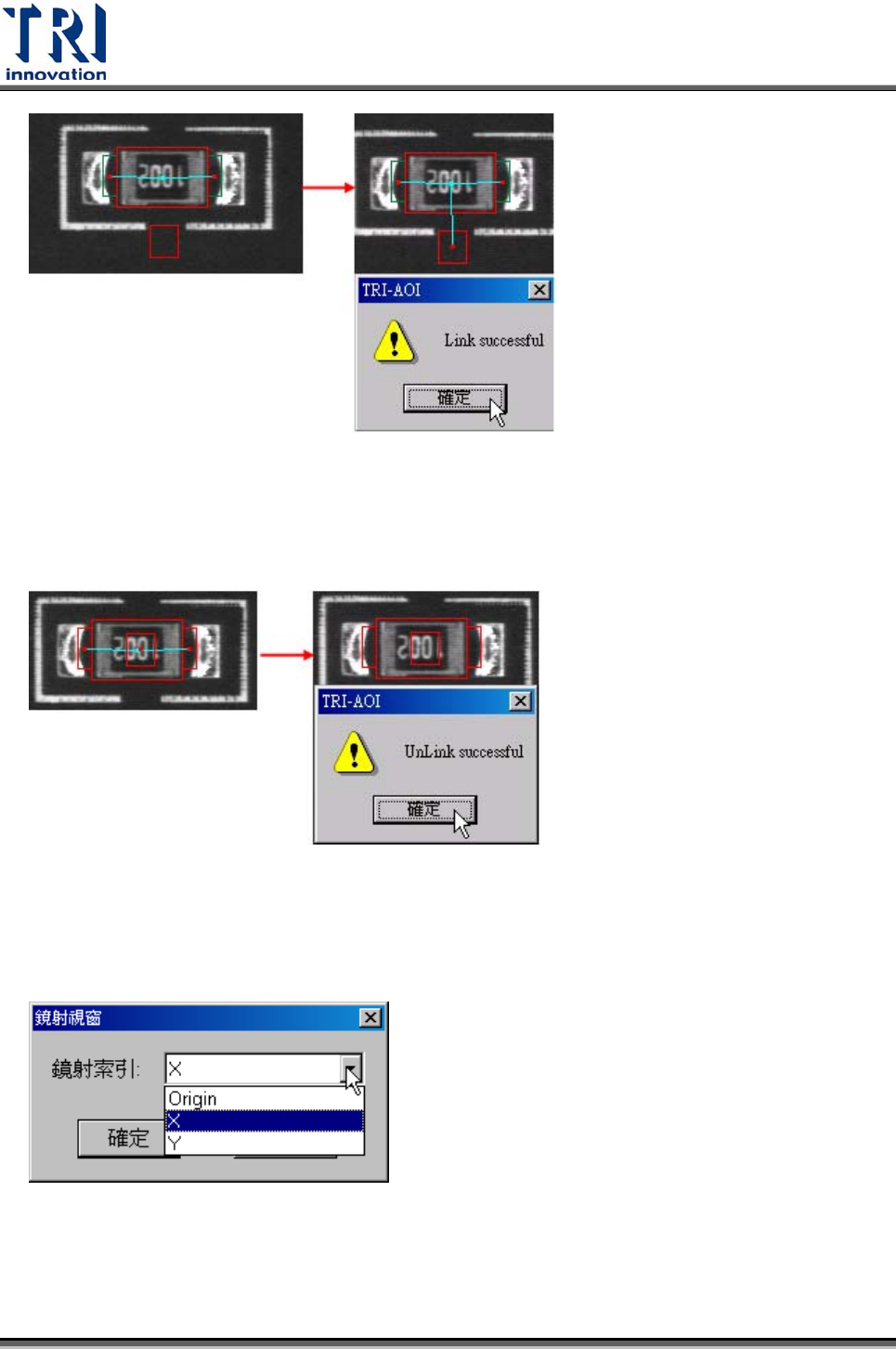 Test Research Inc. TR7500SeriesUserGuide – Software 321 4.9.3.6 旋轉複製 (Rotate Copy) 此功能可將選取的框往指定的角度作複製,旋轉時是以元件本體框的中心點為圓心。 可選擇的角度限制在 90 、 180 即 270 度三個選項。 以 90 度旋轉複製為例 4.9.3.7 旋轉方向性 (Rotate Side) 按一次可將所選擇腳位的方向逆時針旋轉 …