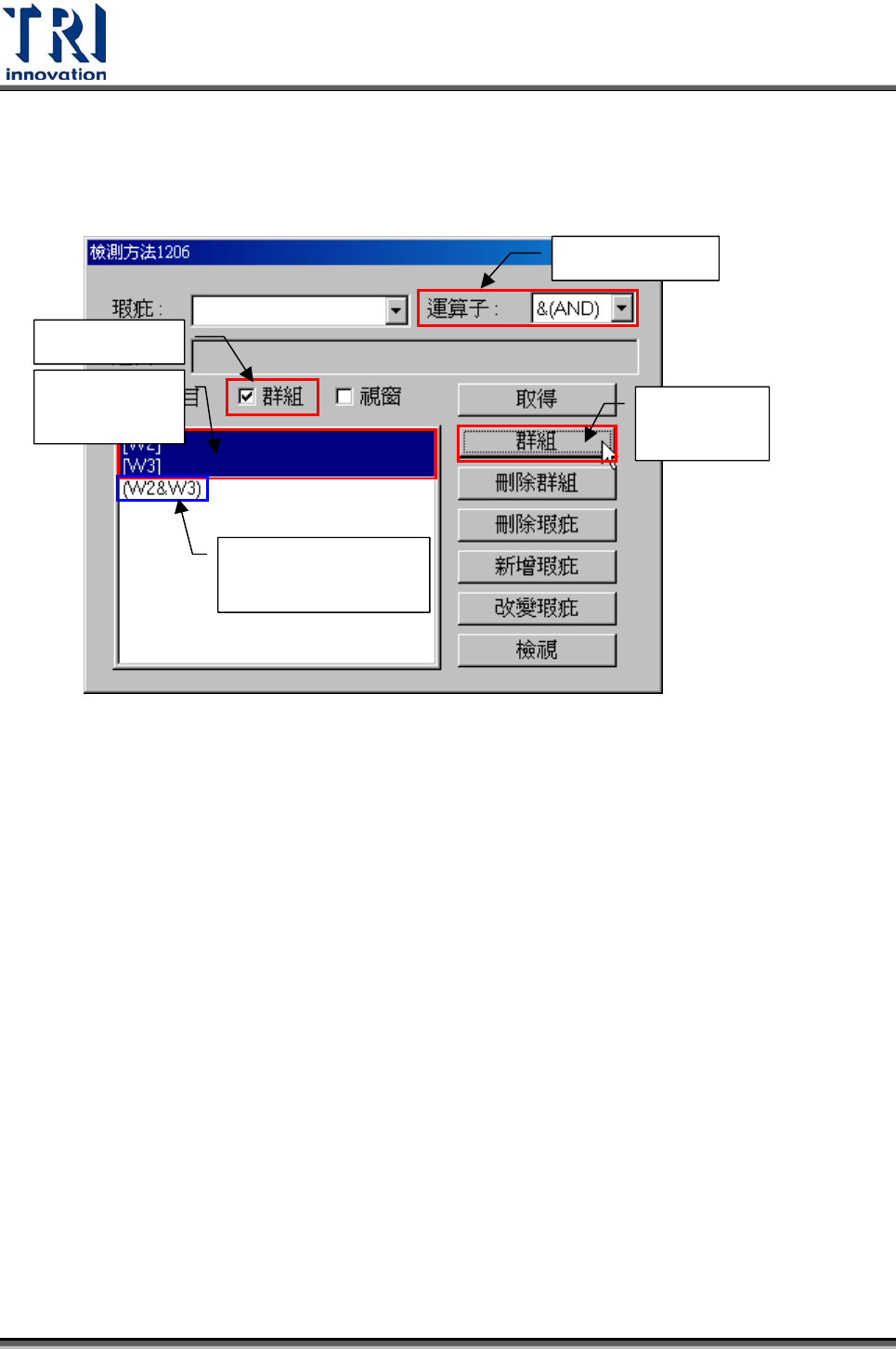 按下[群組],即可將選擇的檢測框用運算子結合起來,[群組]的結果列在視窗列表