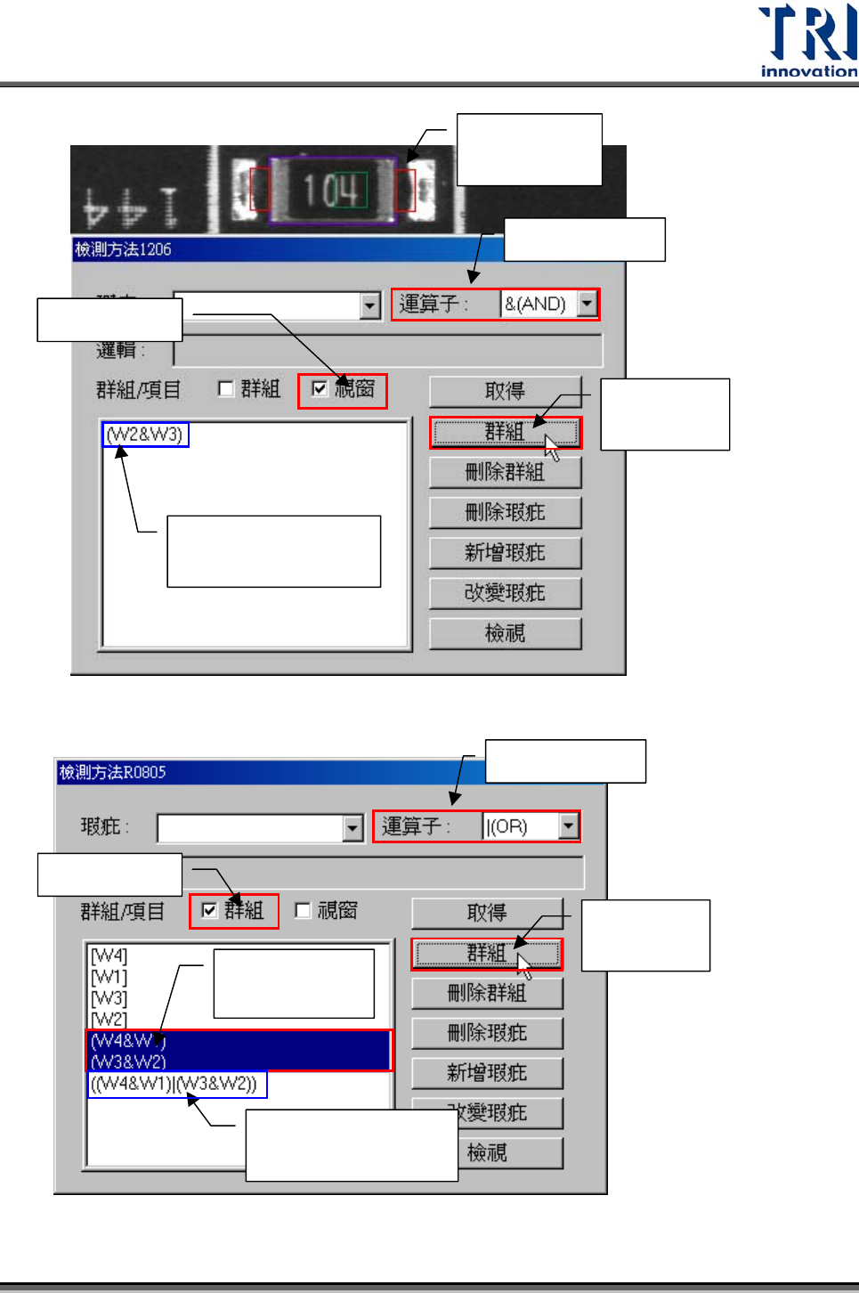 Test Research Inc.  TR7500SeriesUserGuide – Software 357 2. 選擇運 算子 3. 選擇視 窗 4. 按下 [ 群 組 ] 按鈕 5. 結果 :出 現 以運 算子連接 的群組 1. 選擇欲 設 定的視窗 z 以多個群組建立更複雜的邏輯 1. 選擇運 算子 2. 選擇群 組 4. 按下 [ 群 組 ] 按鈕 5. 結果 : 出現以 運 算子連接 的群組 3. 選擇其 他欲…