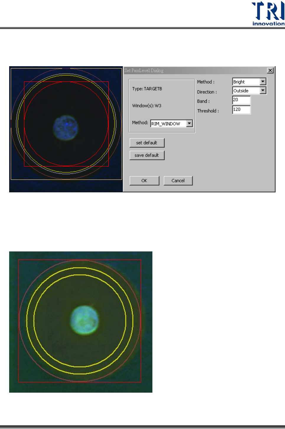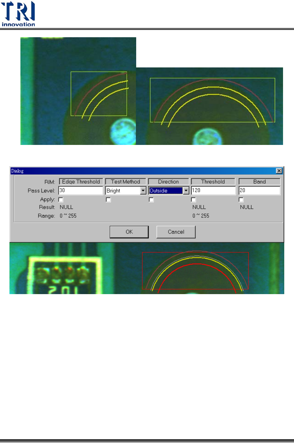 Test Research Inc. 416 TR7500SeriesUserGuide – Software  參數設定。用滑鼠點選你所要設定的圓,按 [Setting] 按鈕來設定 [Pass Level ]。 z Edge Threshold – 同 Library RIM BODY 的 Edge Threshold 。 z Test Method – 同 Library RIM Window 的 Method 。 z…