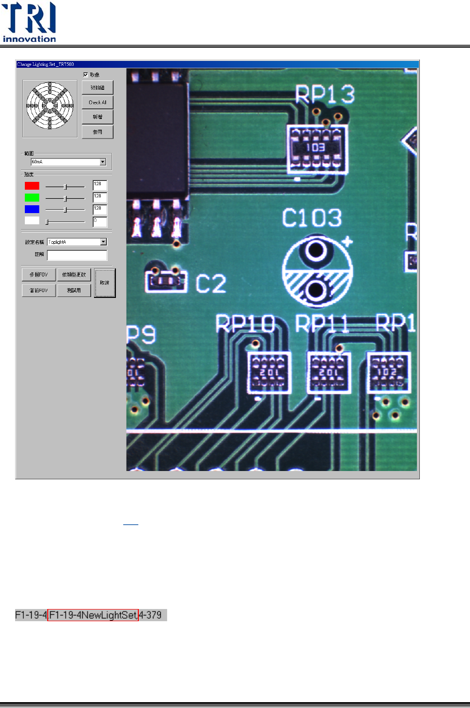 Test Research Inc. TR7500SeriesUserGuide – Software 483 若燈光以其他燈光預設值修改,系統會詢問是否要以新光源命名。若選擇 [ 是 ] ,表 示系統會以 FOV 編號命名此燈光,且所有同時更改的 FOV 一同樣使用此組名稱的 燈光;若選擇 [ 否 ] ,表示系統會以所使用的燈光名稱來命名。 是 否 5.6.11 教導 (T RAIN )/ 解除教導 (U NTRAI…