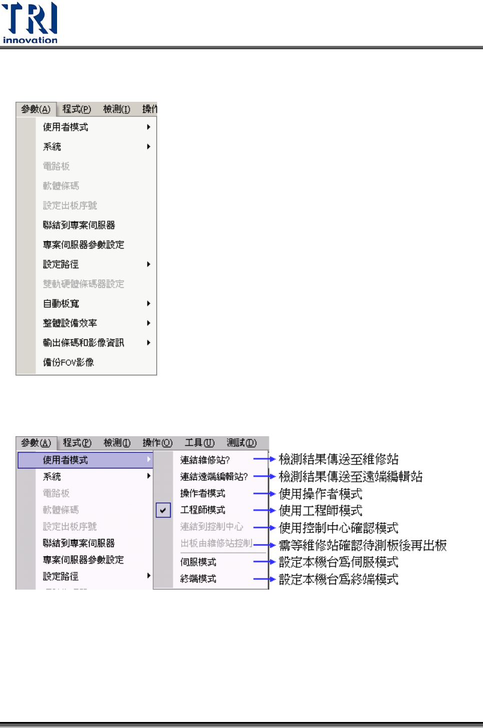 Test Research Inc. TR7500SeriesUserGuide – Software 65 3.3.1.2 連結遠端編輯站 ?(Link to Offline Editor?) 勾選表示需將機台之檢測結果與遠端編輯站連結。若在登錄檔中設定參數 [Offline=1] 時,表示機器作為遠端編輯站使用,此時這個選項會顯示為 [ 連線到主機 ?] 。遠端編輯 站詳細功能請參閱 9 。 3.3.1.3 操作者模式…