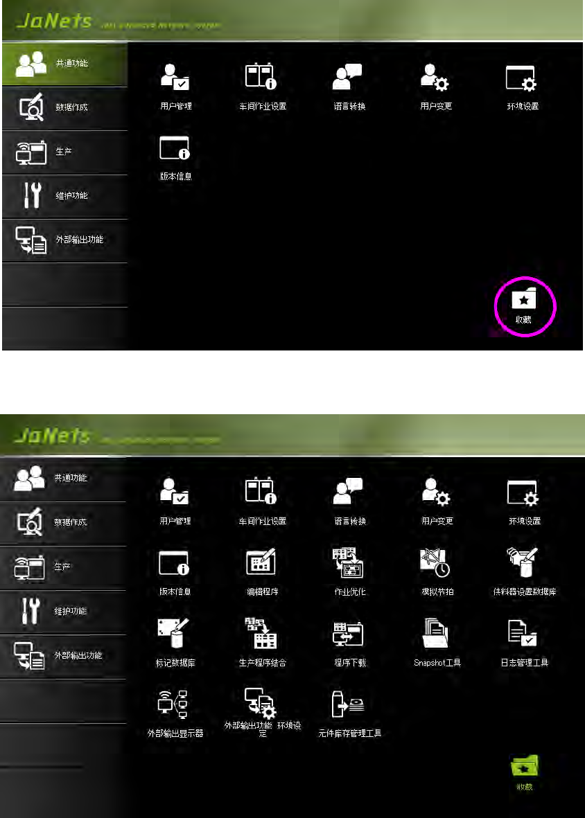 JaNets 使用说明书 3 平台 3-7 点击收藏图标, 可以显示在收藏 中登录的应用 程序。 图 3-3-3 收藏图标 图 3-3-4 收藏画面