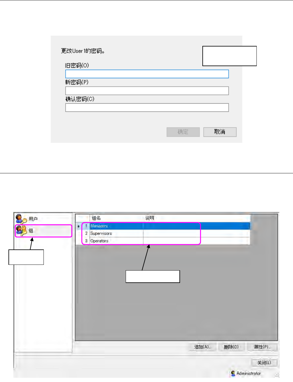 但,选择 Administrator 时,「属性」按钮会变为灰色,无法选择。