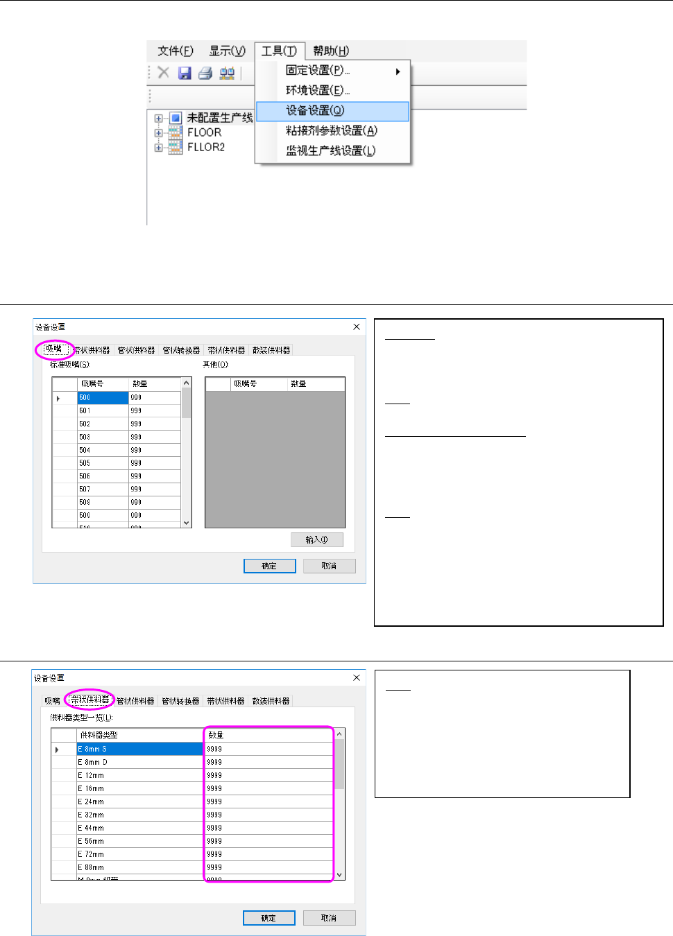 JaNets 使用说明书 5 车间作业设置 5- 39 5-6-2 设备设置 对用户所有的吸 嘴及送料器的数 量进行管理 。 点击 「工具」 ‐ 「设备设 置」 则显示设备 设置画面。 图 5-6-8 「工具」 ‐ 「设备设置」 5-6-2-1 设置吸嘴 图 5-6-9 设备设置画面(吸嘴) 5-6-2-2 设置供应装置 的数量 图 5-6- 10 设备设置画面(带式送料器) 数量: 设置用户所有的带式 ( 带状) 供料器 的数量。 ※…