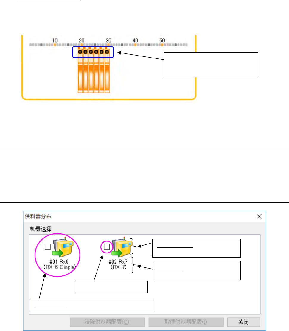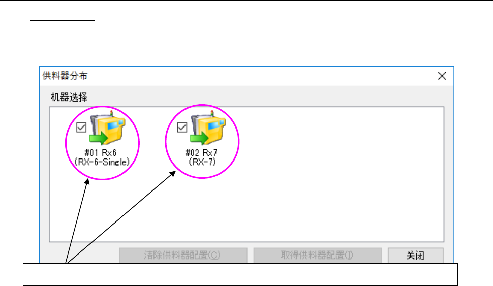 JaNets 使用说明书 5 车间作业设置 5- 82 5-9-6-2 操作方法 选择显示机器 点击选择机器的 按钮,可显示相 应机器的供料 器分布画面。 图 5-9- 51 在机器选择对话框中选择多台机 器时的示例 可同时显示多个供料器分布画面。在供料器分布的显示画面上,勾选机器的选择按钮,即可显示该画面。