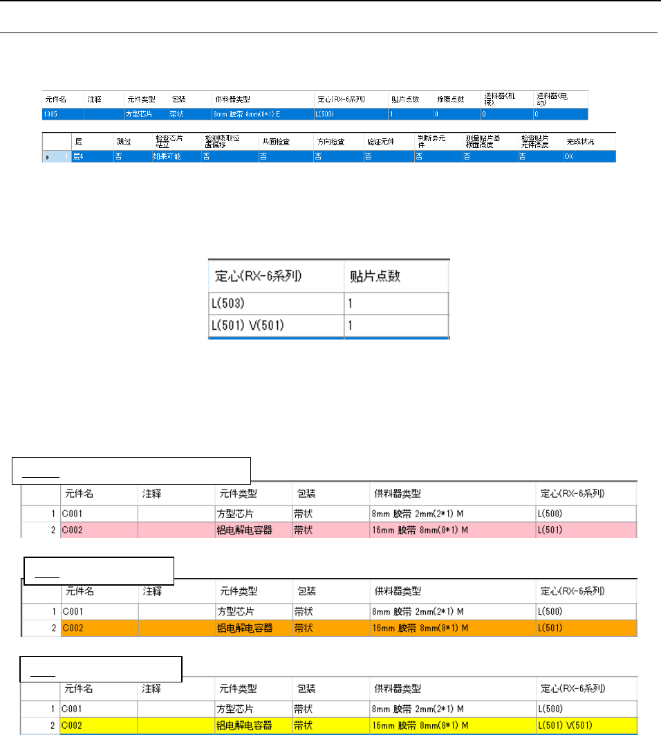 JaNets 使用说明书 7 编辑程序 7- 25 7-4-3 编辑元 件数据 7-4-3-1 元 件数据列表的显 示 在树形控件中选 择了元件数据时 会显示此画面 。 未链接到贴片数 据的元件数据也 会显示出来。 图 7- 33 元件数据列表 定心(吸嘴号) 按各机种显示如 下。 仅显示与所选择 的构成生产线机 型对应的定心 项目。 选择由 RX -6 构成的生产线时 图 7- 34 吸嘴号的显示模式 元件数据显示颜 色的各状态说明 …