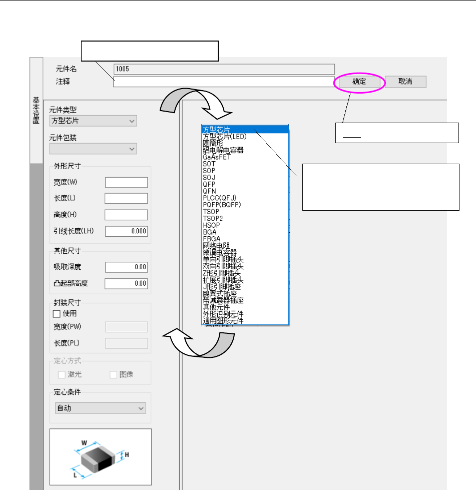 制作元件的种类、包装、尺寸、定心方式等基本数据。