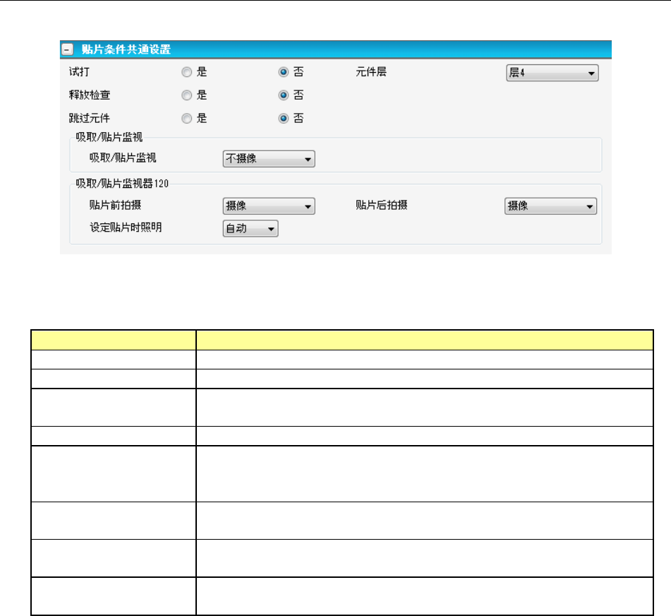 JaNets 使用说明书 7 编辑程序 7- 46 7-4-3-7 贴 片条件共通设置 画面 此画面,用于设 置元件贴片时的 机型共通数据 。 图 7- 65 贴片条件共通设置画面 表 7- 30 贴片条件共通设置画面项目 项目 说明 试打 逐个指定执行试打时是 否贴装本元件。 释放检查 指定是否在贴装激光定 心元件后, 用激光检查元件 是否还附着在上面 。 跳过元件 逐个指定元件在生产时 是否进行贴装。 读入固定信息或从数据 库读入元…