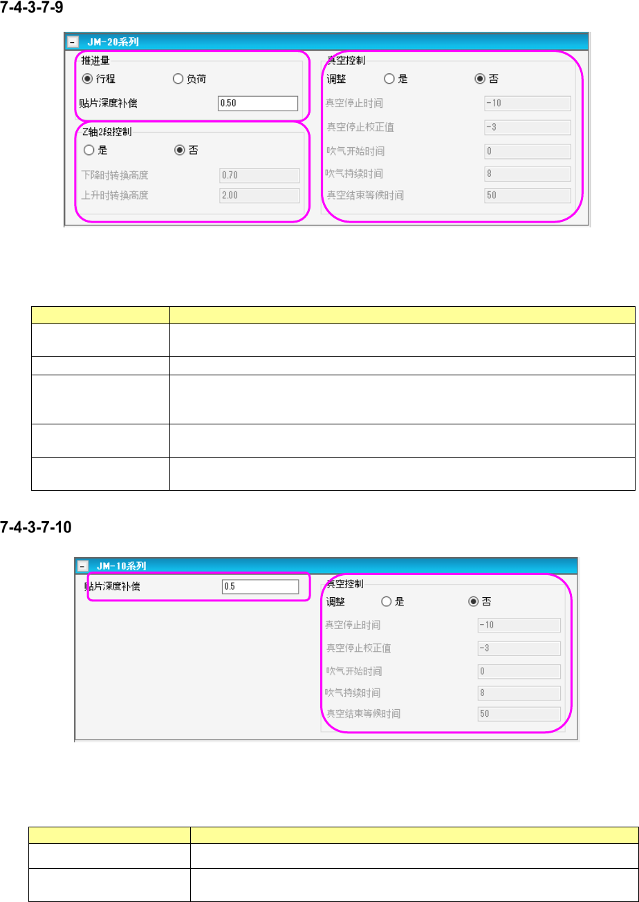 JaNets 使用说明书 7 编辑程序 7- 53 贴片条件画面 ( JM - 20 系列 ) 图 7- 74 贴片条件 ( JM - 20 系列 ) 画面 表 7- 40 贴片条件 ( JM - 20 系列 ) 画面项目 项目 说明 Z 轴 2 段控制 指定贴片时是否对吸嘴上升、下降的速度进行 2 段控制。 2 段控制时,要在上升及下降中分别输入进行 2 段控制的高度。 控制方式 对吸取元件时将吸嘴前 端推进多少,通过「 行程」 「负…