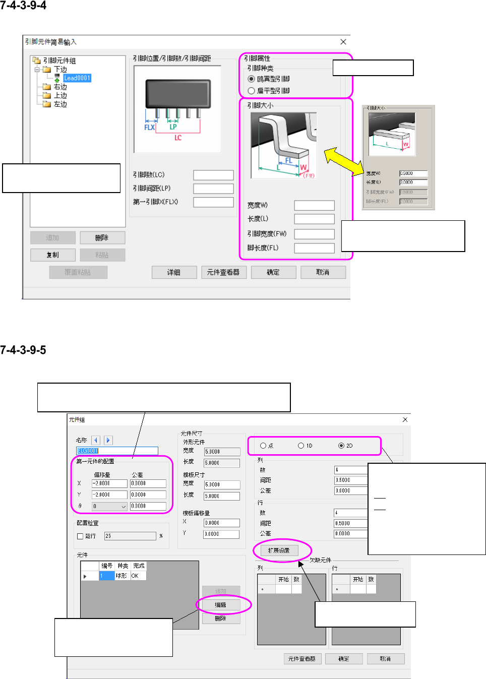 根据位图的显示,对各元件(要素)组的引脚数、引脚间距、长度、宽度等进行明确易懂的设置。