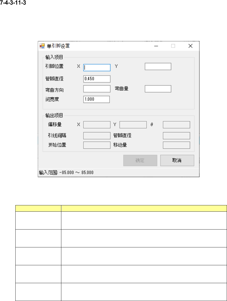 JaNets 使用说明书 7 编辑程序 7- 102 单引脚设置 单引脚设置画面 ,是对单引 脚输入配对 信息的辅助 画面。 所选择配对的 弯脚固定方法 ,为「由外向内」 或「由内向外」 时,可以进行 输入。 设置全部的输入 项目,按下确定 按钮后,向 选择的配对反映输出 项目 的 内容。 图 7- 140 单引脚设置 画面 表 7- 74 单引脚设置项目 项目 内容 引脚位置 X/Y 输入贴片点基准的引脚位置 X 及 Y 。 输入范围…