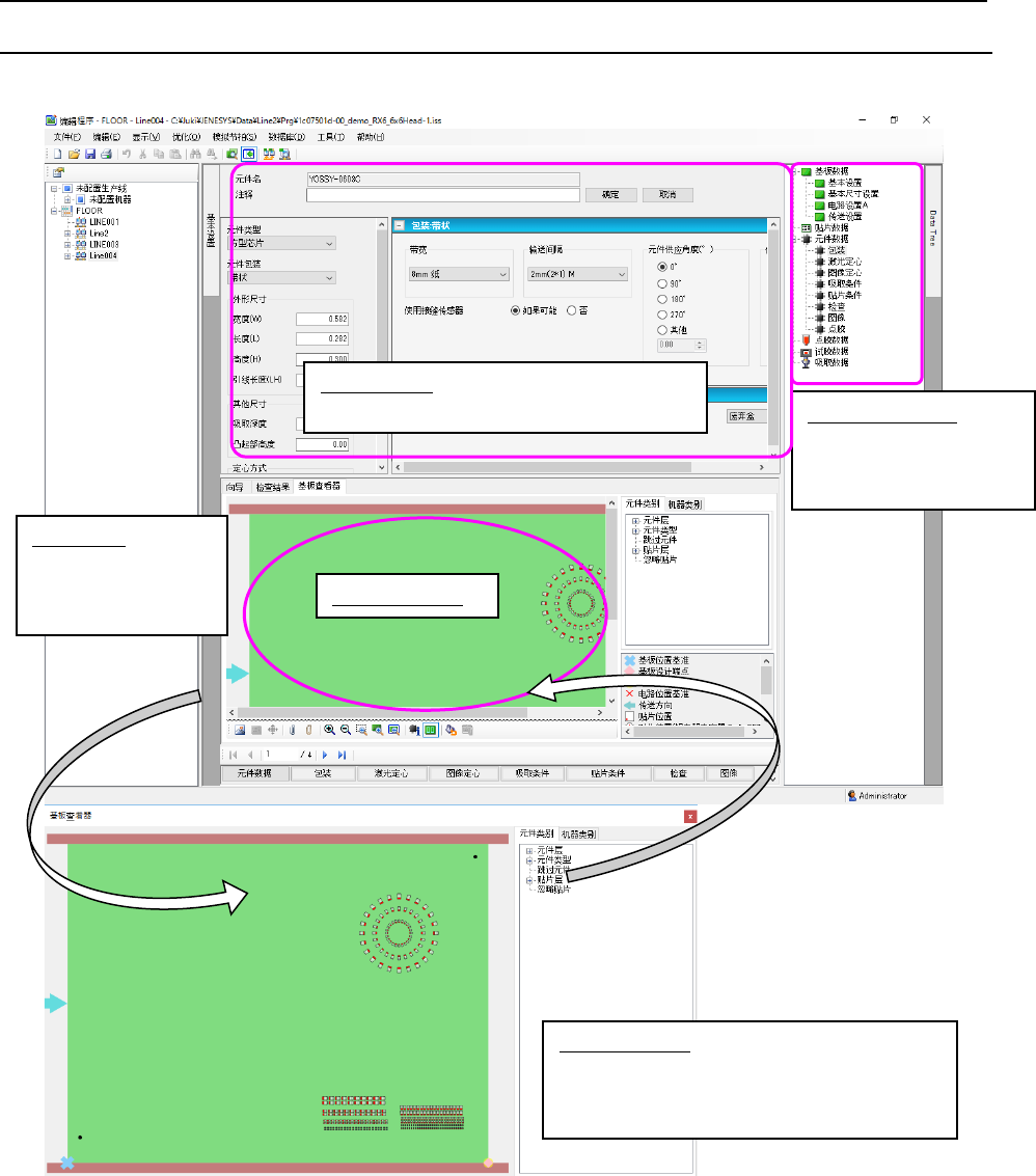 JaNets 使用说明书 7 编辑程序 7- 11 4 关于查看器显示区域的选项卡 向导:显示当前 选择项目的相关 说明 检查结果:显示 数据一致性检查 结果 基板查看器:用 图形方式确认基 板传送方向、 基板分布偏移量 、定位孔位置 、元件配置等。 双击相应元件, 选择显示相应的 贴片数据。 图 7- 158 基板查看器上的名称说明 元件 D 电路配置 双击显示的元件,会显示相应的贴片 数据 基板传送方向 基板基准位置 孔位置 元件 …