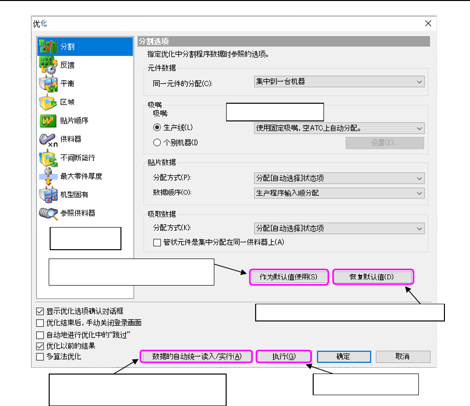 JaNets 使用说明书 7 编辑程序 7- 152 7-7-3 优化对 话框 图 7- 214 优化对话框 ( 与编辑程序时 ) ※ 仅在为生 产线 模式 ,且 环境设置 的「 元件数据的自 动统一读 入」或者「 标记数据的 自 动统 一 读入」 (※)为 「是」 时,予以显示。 选项选择区域 优化选项设置区域 按指定条件执行优化。 使变更的设置无效,返回标准(初始设置) 。 将变更的设置注册为初始值,从下次 启动开始即首先显示此变更…