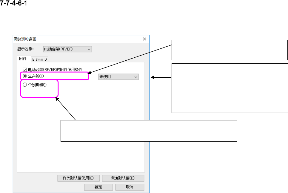 JaNets 使用说明书 7 编辑程序 7- 164 附件 可以指定优化中 电动台架 (RF /EF) 的附件的使用条 件。 可以 选择 生 产线单 位,或者各台设备,若 指定为 各台 设备,可以以 台架为单位进行 指定。 图 7- 225 附属选购项 勾选后,可以指定附件的使用条件。 未勾选时,按照「未使用」动作。 使用条件可以从以下 2 种中选择 未使用: 电动台架 (RF/EF) 上不可配置 EF 。 使用: 电动台架 (RF/E…