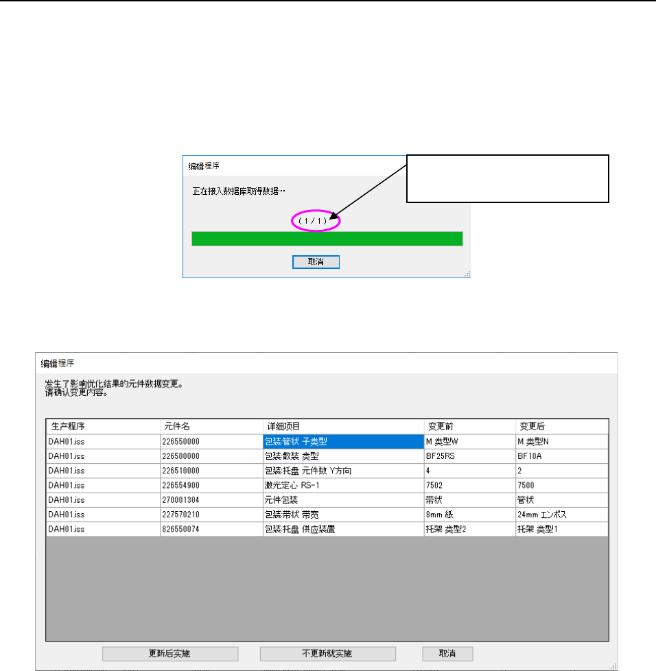 JaNets 使用说明书 7 编辑程序 7- 181 7-8-2 实施 自动统一读入 在环境设置的「 元件数据的自动 统一读入」或 者「标记数据的 自动统一读入 」为「是」时, 接入 各数据库更新生 产程序的数据。 此步骤是 在按下 「数据的自动统一读入 / 数据的一致 性检查」 按钮 和优化的「自动 统一读入 / 执行」时实施, 在更新后再 分别进行一致性 检查 和优化。 ※ 开始自动 统一读入 前,先保存生 产程序 。 开始自动 统…