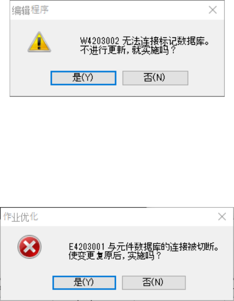 未接入数据库,或 数据库接入中被切断时,显示以下对话框。按下「是」,返回 统一读入前的生产